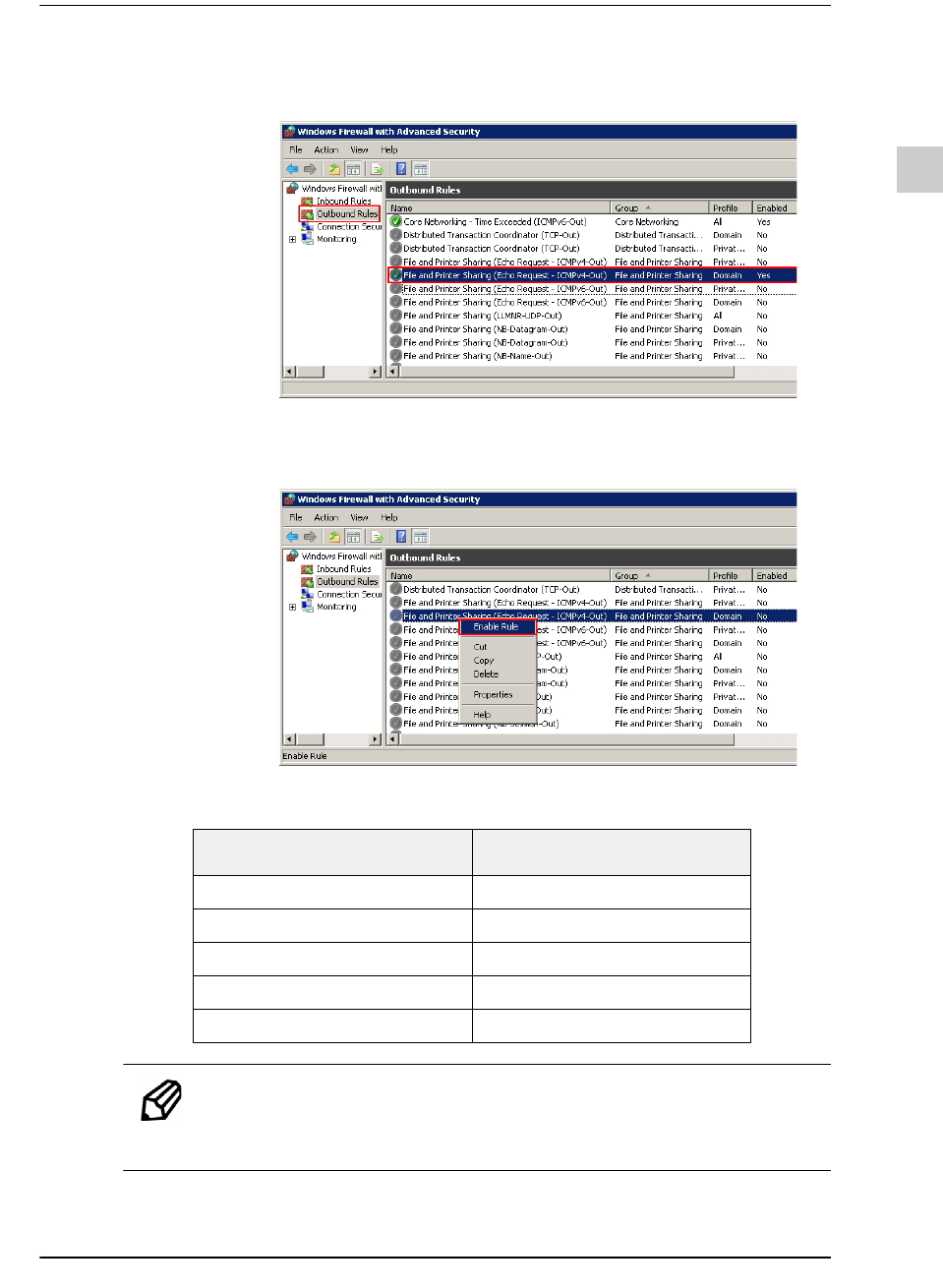 3-9 PC 配置及软件前置安装 STEP5. 选择了 “Outbound Rules” 后, 确认是否使用 “F il e a nd Pr i nte r Sha r in g (Echo Request - ICMPv4-Out)” ”File and Printer Sharing (Echo Request - ICMPv4-Out)” 的 “Enable” 被设定成 “No” 的话, 单击鼠标右键后在弹出式菜单选择 “Enab…