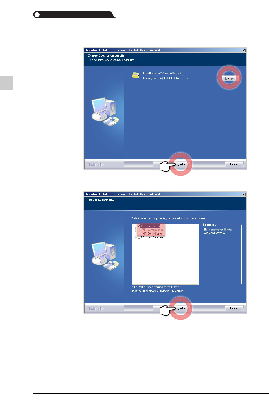 4-10 {TzYG|˅Gn {TzYG|˅Gn STEP5. 单击 <Change...> 按钮并选择安装文件的保存位置后, 单击 <Next> 按钮 STEP6. 圈选了 <T -Solution Dat a base> 复选框后, 单击 <Next> 按钮 T-Solution 的服务器有 T-ServiceServer 与…