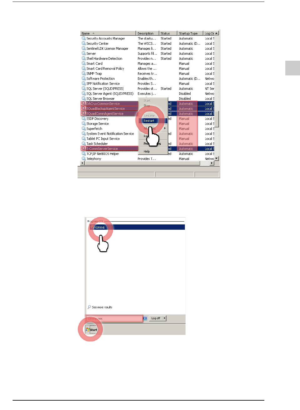4-15 安装 T-Solution Server T -CommServerService 确认 COM + 应用程序的安装 STEP1. 单击视窗任务栏的 < 开始 > 按钮后 , 在 “ 搜索程序和 文件 ” 输入 “comexp.msc” , 在搜索结果选择程序