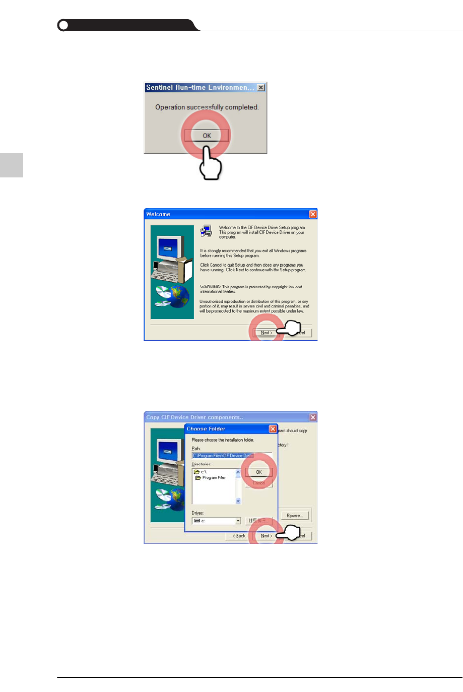 5-8 {TzYG|˅Gn {TzYG|˅Gn STEP10. 确认了程序安装成功的提示信息后, 单击 <OK> 按钮 STEP1 1. 在 SM 设备用驱动程序安装画面单击 <Next> 按钮 安装了程序后,需要按照设备类 型安装相关的驱动程序。 SM 设备需要安装 CIF 驱动程序。 STEP12. 单击 <Browse...> 按钮选择…