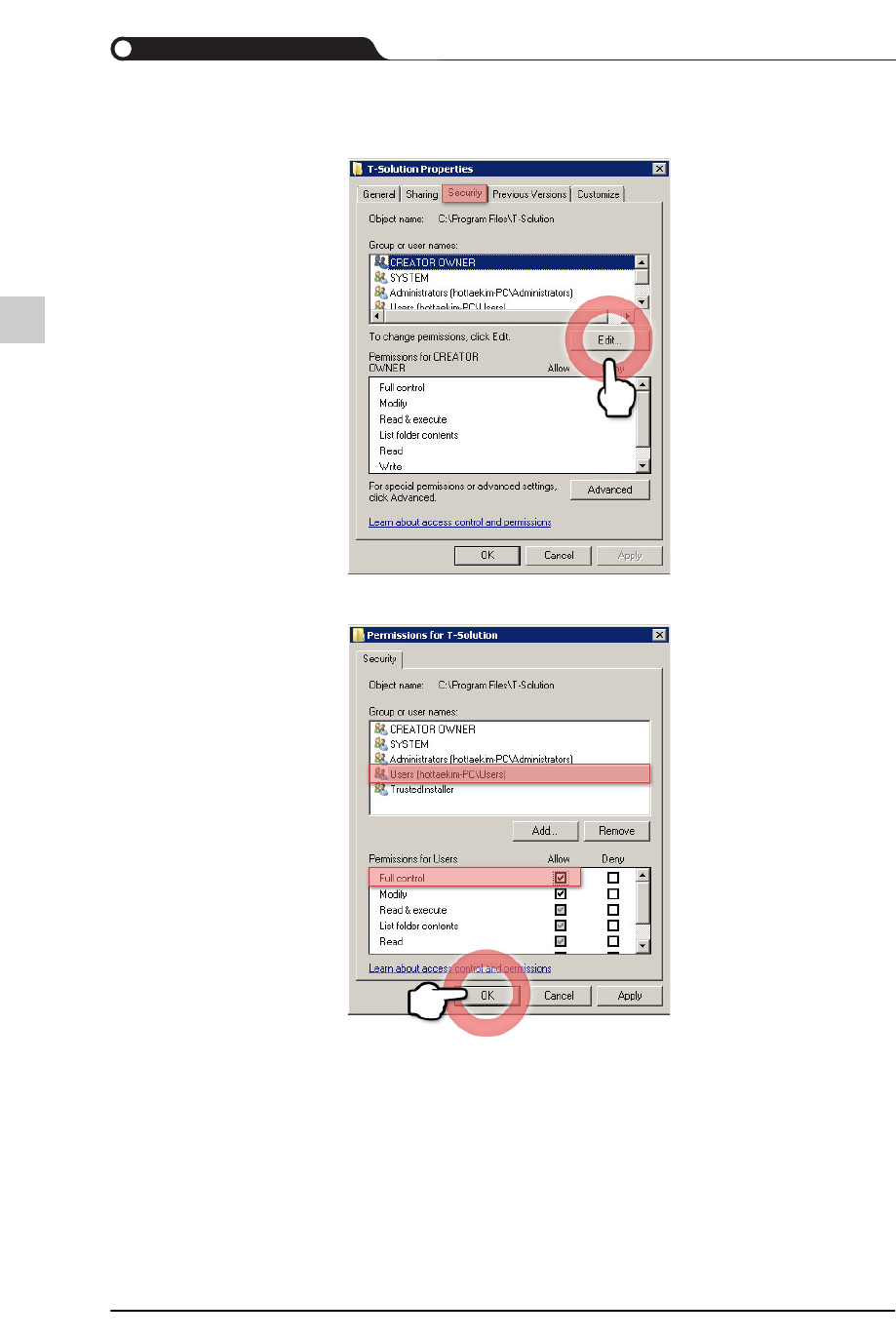 5-29 安装 T-Solution C lient STEP4. 查看当前登录账户的权限是否 为 “Adm inistrator” 无法使用 “Admin istrator” 账户而 只能使用 “User” 账户的话,请参考 下列步骤设置使用者账户的权 限。 1) 选择安装了 T -Solution 的路径的文件夹 后, 单击鼠标右键后在弹出 式菜单选择 “Propert ies”