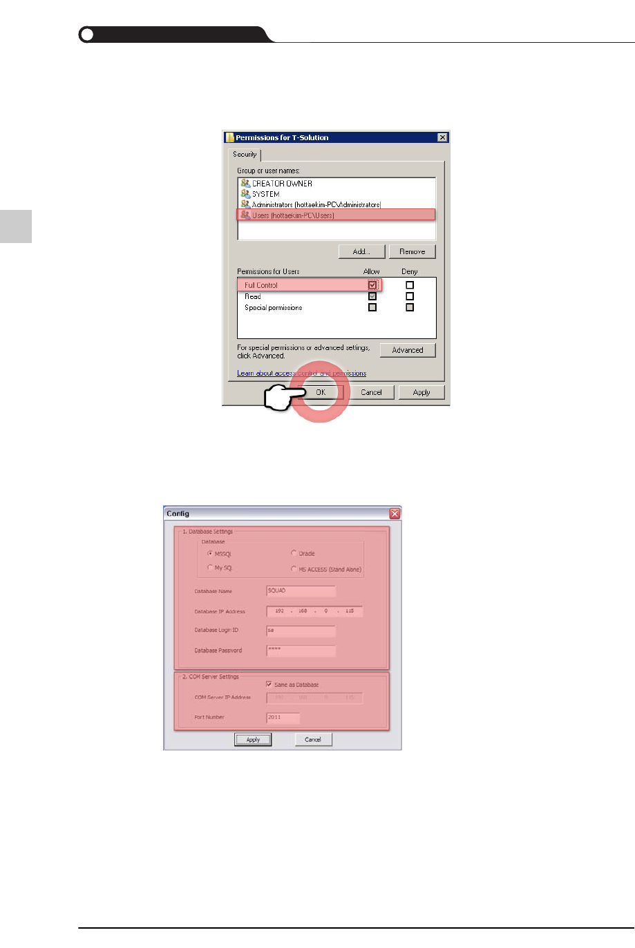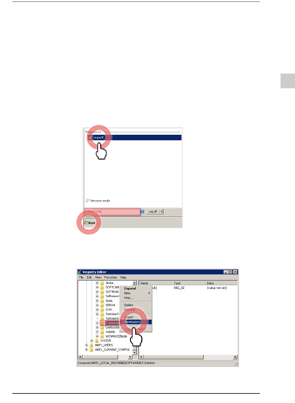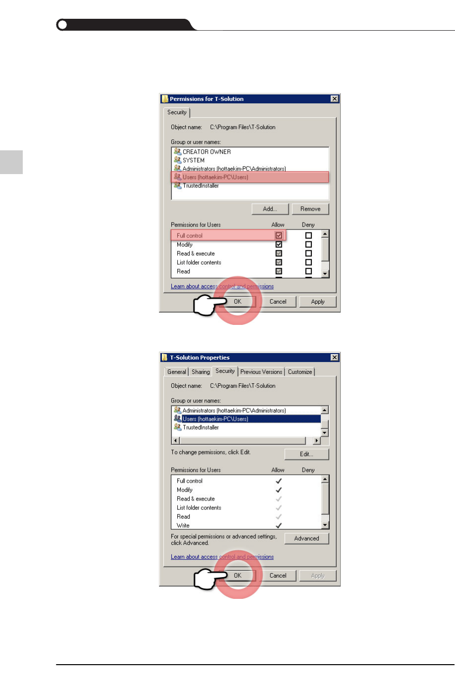 5-35 安装 T-Solution C lient 设置 Registry 接入权限 如果登录到视窗的账户不属于 “A dministrator” 权限群, Registry 可能会发生接入 权限错误。 需要对利用该 PC 的 “A dministrator” 账户接入后使用 T -Solution 程序的所有用 户 账户赋予 Registry 接入权限 。 需要对利用该使用 T -Solution 程序的所有用户账户赋予 Reg…