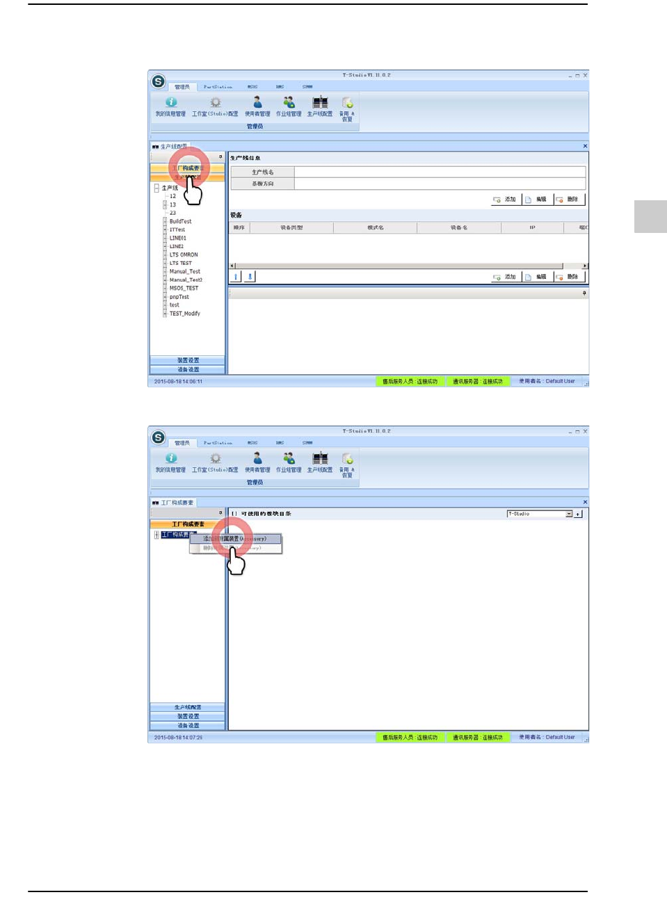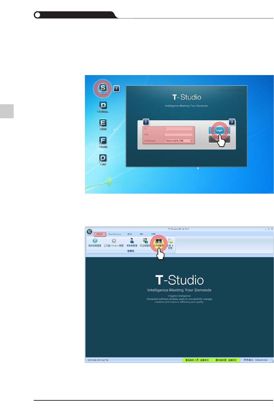 6-2 {TzYG|˅Gn {TzYG|˅Gn 6.1.1. 设定方法 登记 IP 后设定模块的方法如下。 STEP1. 实行 T- S t u d i o 输入 User ID 及 Password ,选择 需要使用的屏幕语言 ( 中文 [zh-CN] ) 后, 单击 <LogIn> 按钮。 STEP2. 在 “ 管理员 ” 选项卡单击 < 生产线设置 &g…