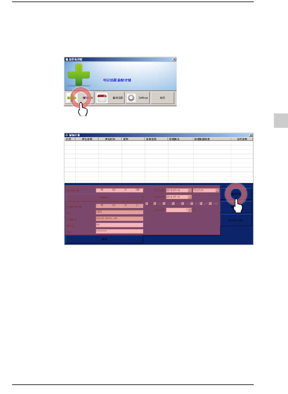 功能说明 > 主菜单 > < 备用 & 恢复 > 按钮 > < 增加计划 > 按钮 )