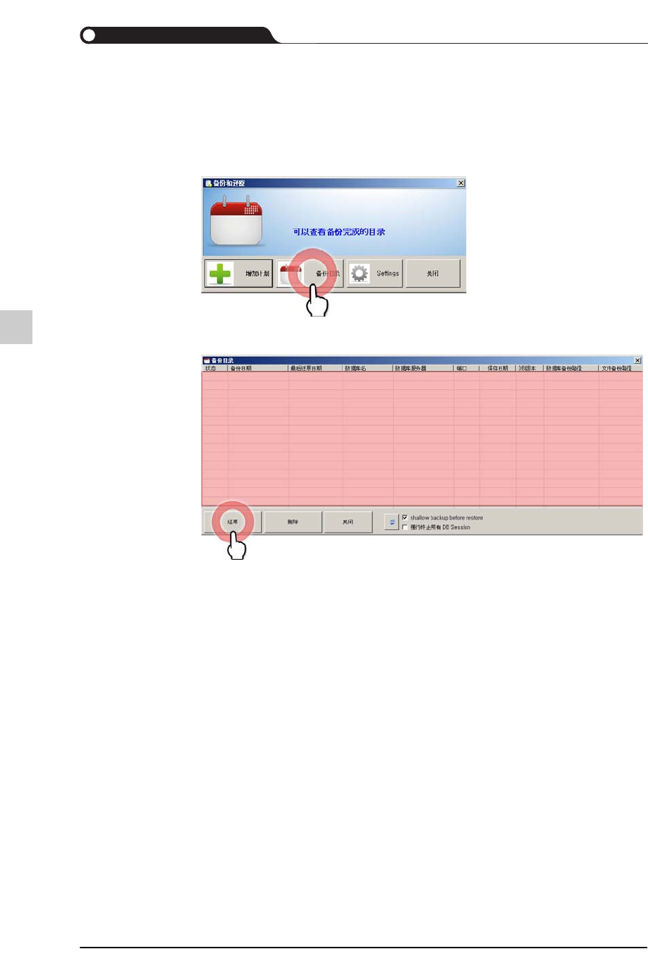 功能说明 > 主菜单 > < 备用 & 恢复 > 按钮 > < 备份目录 > 按钮 )