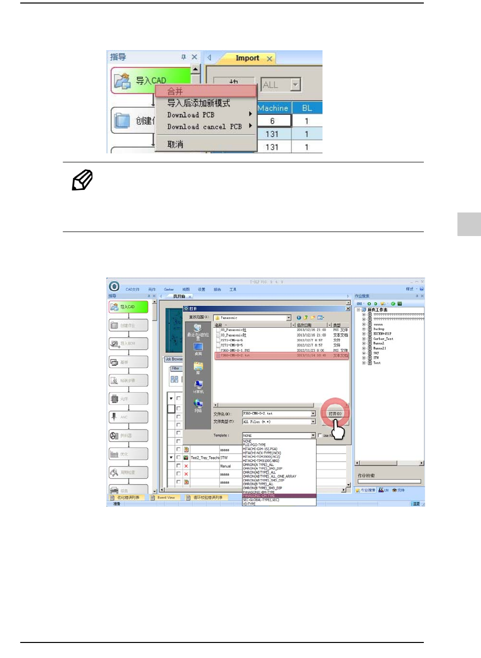 9-35 创建型号数据 STEP1. 第一个 CAD 文件导入完毕后, 单击 < 导入 CAD> 按钮并且选择 “ 合并 ” 备注 针对 PCB 上部面 (TOP) 完成了 CAD 文件的导入后, 如果需要针对 PCB 下部 面 (BOTTOM) 添加型号数据地创建 JOB , 则在弹出式菜 单选择 “ 导入后添加新模式 ” 。 STEP2. 选择具有其它厂商设备所创建的 贴装点数据的 CAD 文件后 , 在 <T e…