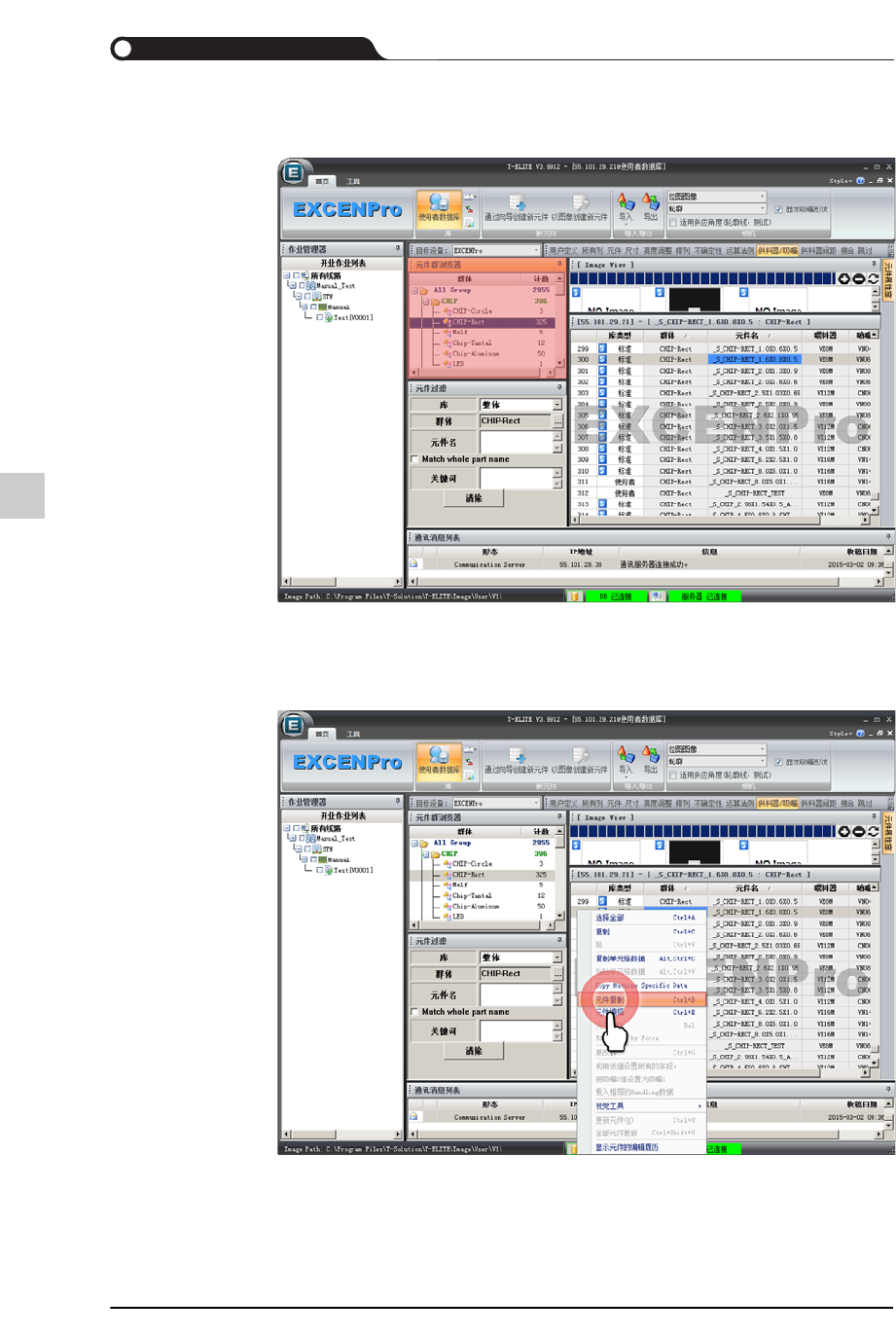 10-12 {TzYG|˅Gn {TzYG|˅Gn STEP3. 在 < 元件群浏览器 > 领域选择元件群 选择需要登记的元件所在的元件 群。各元件根据类型被划分到 各元件 群。 STEP4. 选择了规格相似的元件后, 单击鼠标右键后选择 “ 元件复制 ” 把现有数据库里的元件信息加以 复制并修改后登记新元件。选 择其规格 和待登记元件最相似的元件。