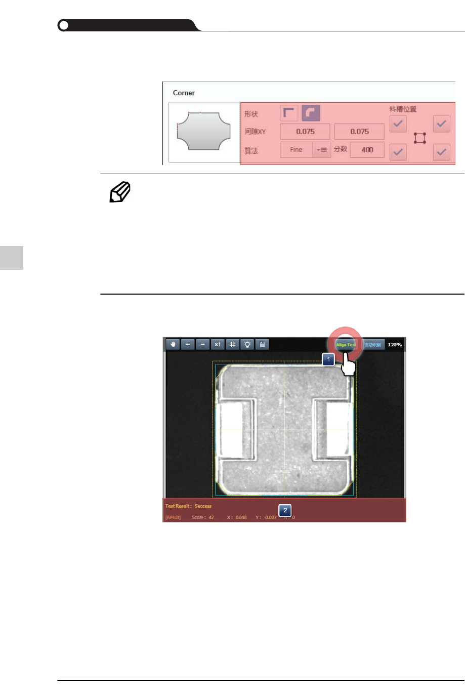 10-28 {TzYG|˅Gn {TzYG|˅Gn STEP3. 符合元件形状地设置角部参数 备注 为了把元件的形状接近矩形而引脚 形态不明确并且主体较亮 而难以识别引脚的元件加以登记, 适用 Corner 算法。 关于 Corner 算法种类的详细内容, 在 WEB 手册, 请参阅 “ 形选 择框 ” 。 (WEB 手册 路径 : T -Solution2 > 查看菜单…