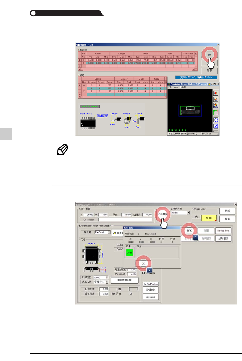 10-83 登记新元件 STEP14. 单击 < 亮度调整 > 按钮进行照明调整以便让识别对象清 晰地显示出来, 单 击 < 确定 > 按钮 STEP15. 一边查看视觉窗一边包含整体元件形状 地设置 Body X / Y ,单 击 < 引脚 参 数组 & 组 > 按钮