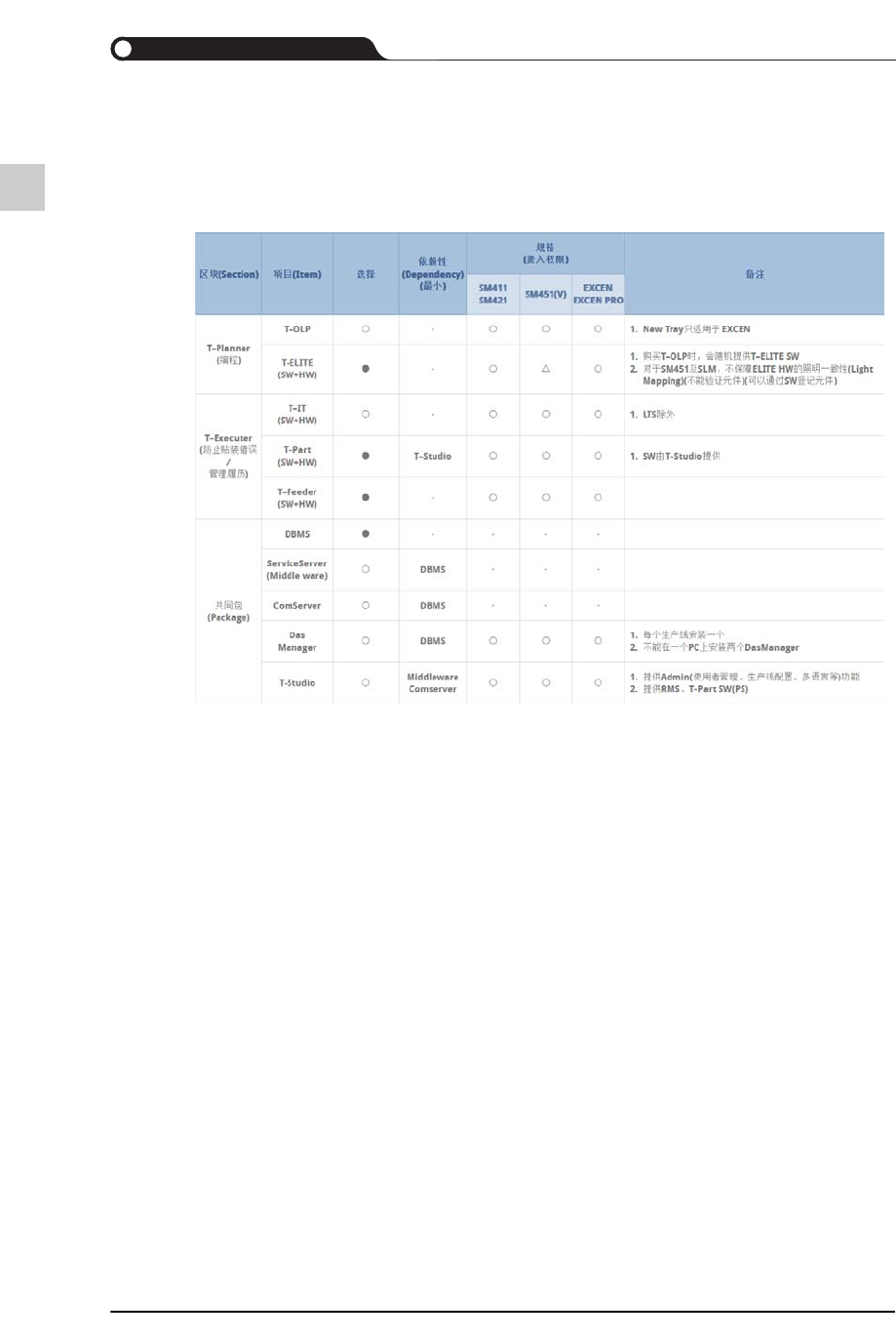 T-Solution的可适用设备会随着各SW模块而不同。参考下表确认各程序可以适用的