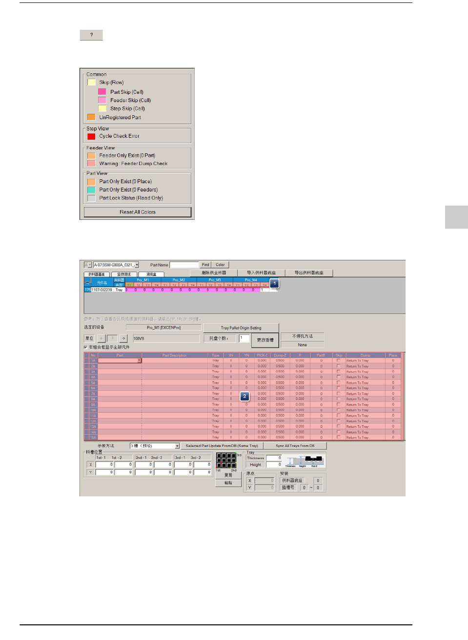 11-18 {TzYG|˅Gn {TzYG|˅Gn 元件目录 显示出通过安装在目前所选区 块 (section) 上的盘式供料器供应的元件的信 息。 通过元件信息的更新实现盘式 供料器信息的更新 单击 <Selected Part Update From DB (Same T ray)> 按钮, 就会在服务器 DB 导 入选自元件目录的元件的盘式 供料器信息…