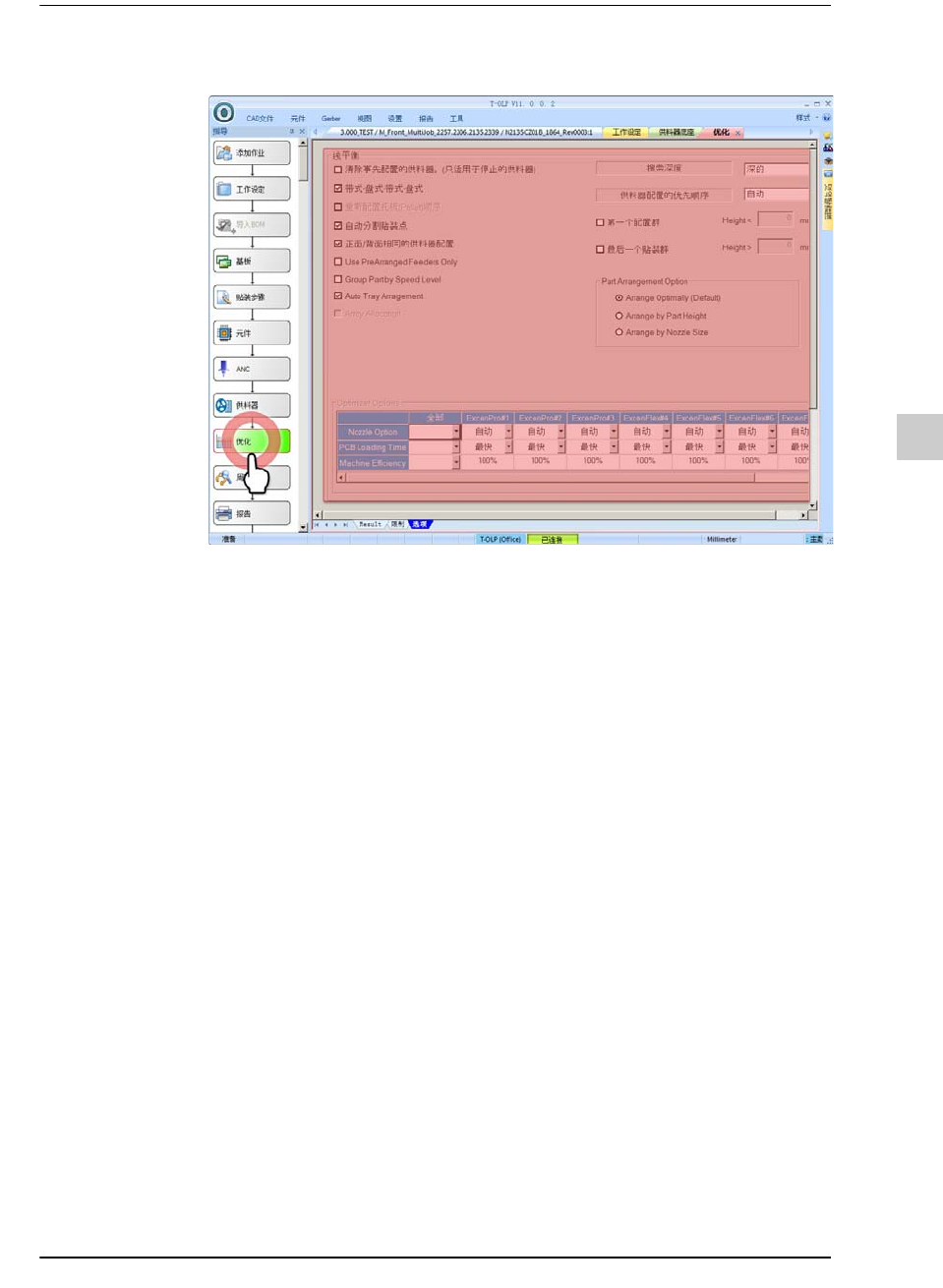 11-61 优化 PCB 程序 STEP4. 单击 < 优化 > 按钮后选择 “ 选项 ” 选项卡, 然后如下图所示地设置选项 < 带式 - 盘式 - 带式 - 盘式 > 复选框 < 自动分割贴装点 > 复选框 < 正面 / 背面相同的供料器配置 > 复选框 <Auto T ray Arragement> 复选框 < 优化 > 领域 <…