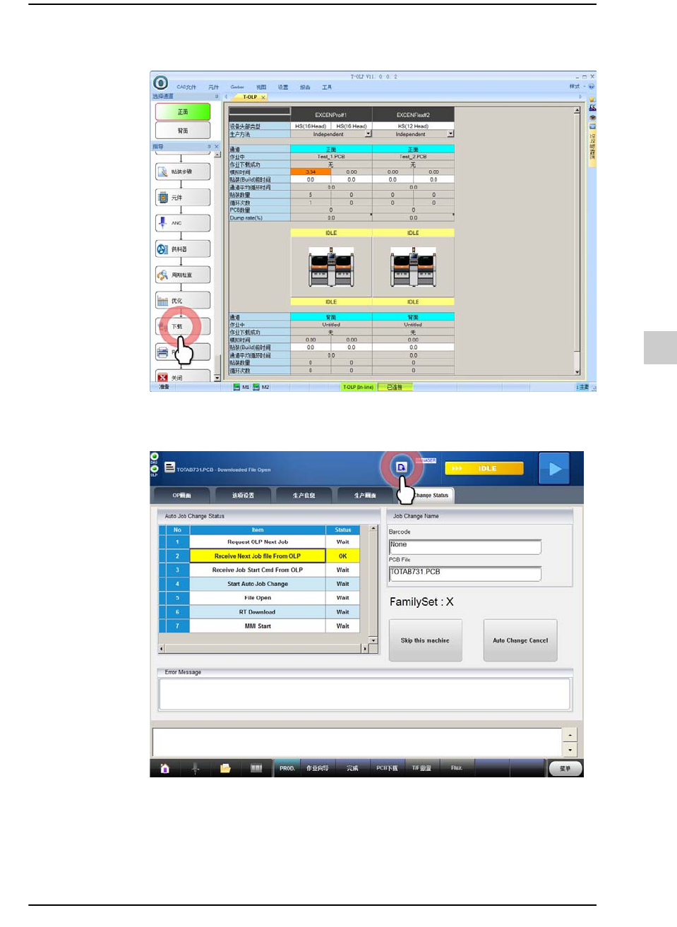 12-56 {TzYG|˅Gn {TzYG|˅Gn STEP5. 设备状态变成 “RUN_RDY” 时, 在设备同时按压 OP 面板的 “ENABLING” 按 钮与 “ST AR T” 按钮后开始生产。 12.8.9. 下载程序 (MMI) 在设备的 MMI 下载 PCB 程序的方法如下 。 STEP1. 在设备的条形码扫描器扫描料盘 列表的条形码。 如果无法使用条形码扫描器…
