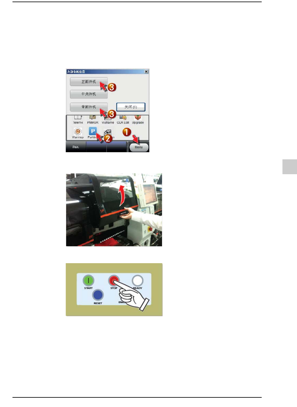 13-17 生产 13.3.3.3. Backup Pin 设置 ( 手动 ) 不具备自动顶针功能的设备则需要 以手动方式把顶针配置到 BackUp T able 上。 在 EXCEN PRO 设备以手动方 式把顶针配置到 BackUp T able 上的过程如下。 STEP1. 在 MMI 实行 Gantry Parking 。 STEP2. 打开正 / 背面的安全门 (Door) 。 STEP3. 按压 <STOP> 按…