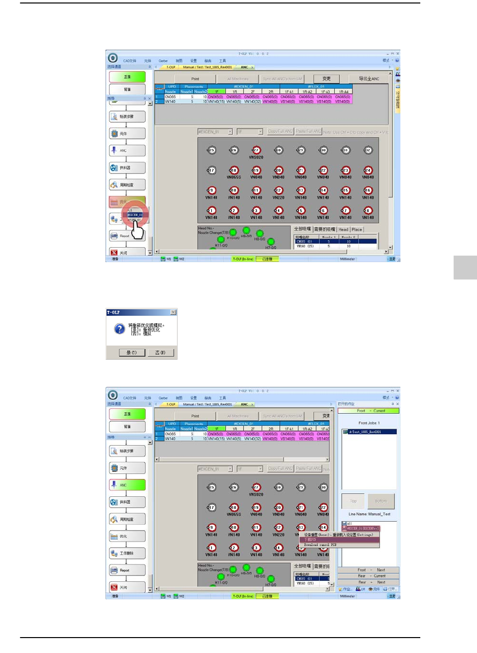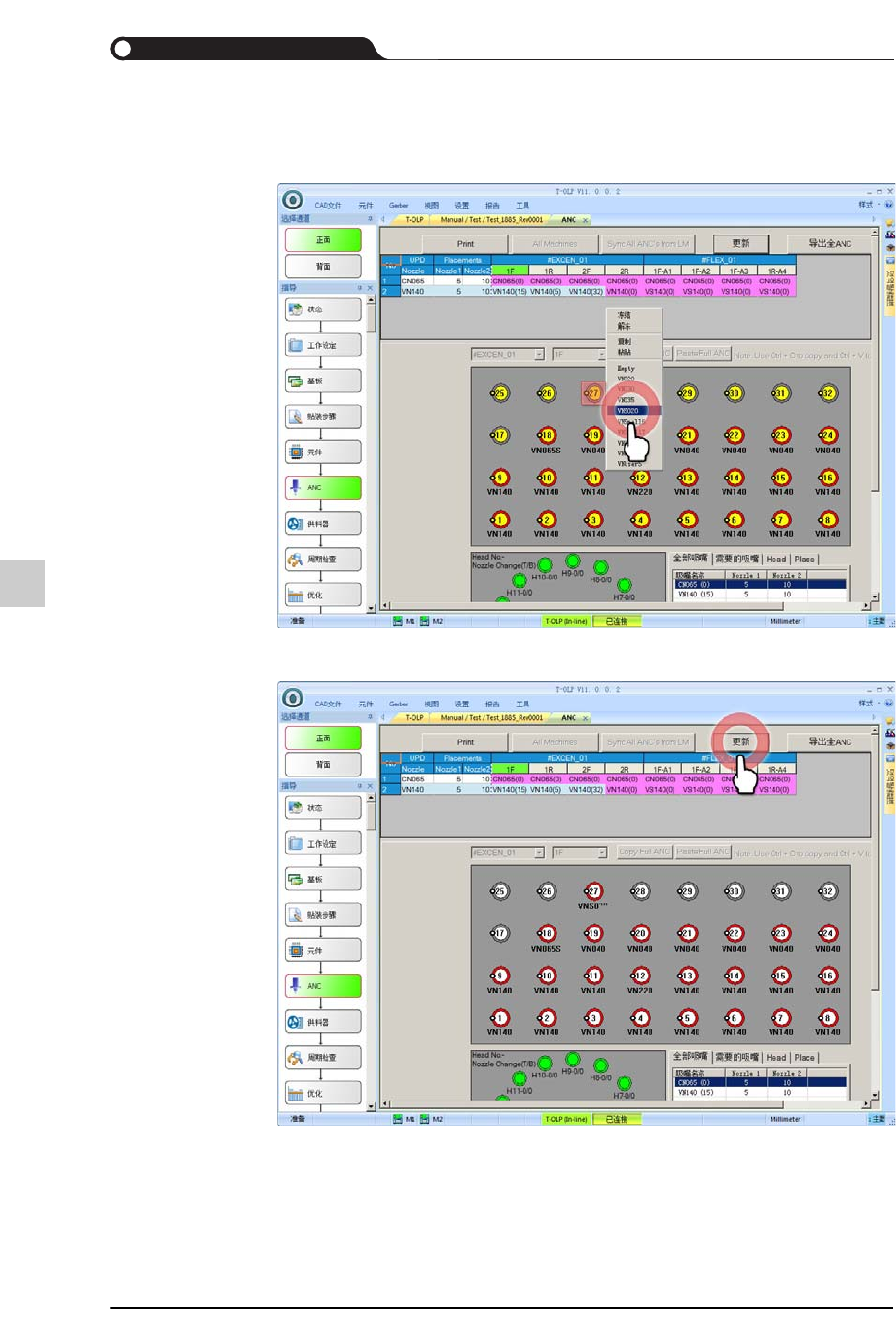 13-40 {TzYG|˅Gn {TzYG|˅Gn STEP2. 选择了需要变更吸嘴的 ANC 和该 ANC 的孔后, 单击鼠标右键后选择需要 变更的吸嘴。 STEP3. 单击 < 更新 > 按钮保存所更改的吸嘴配置信息。