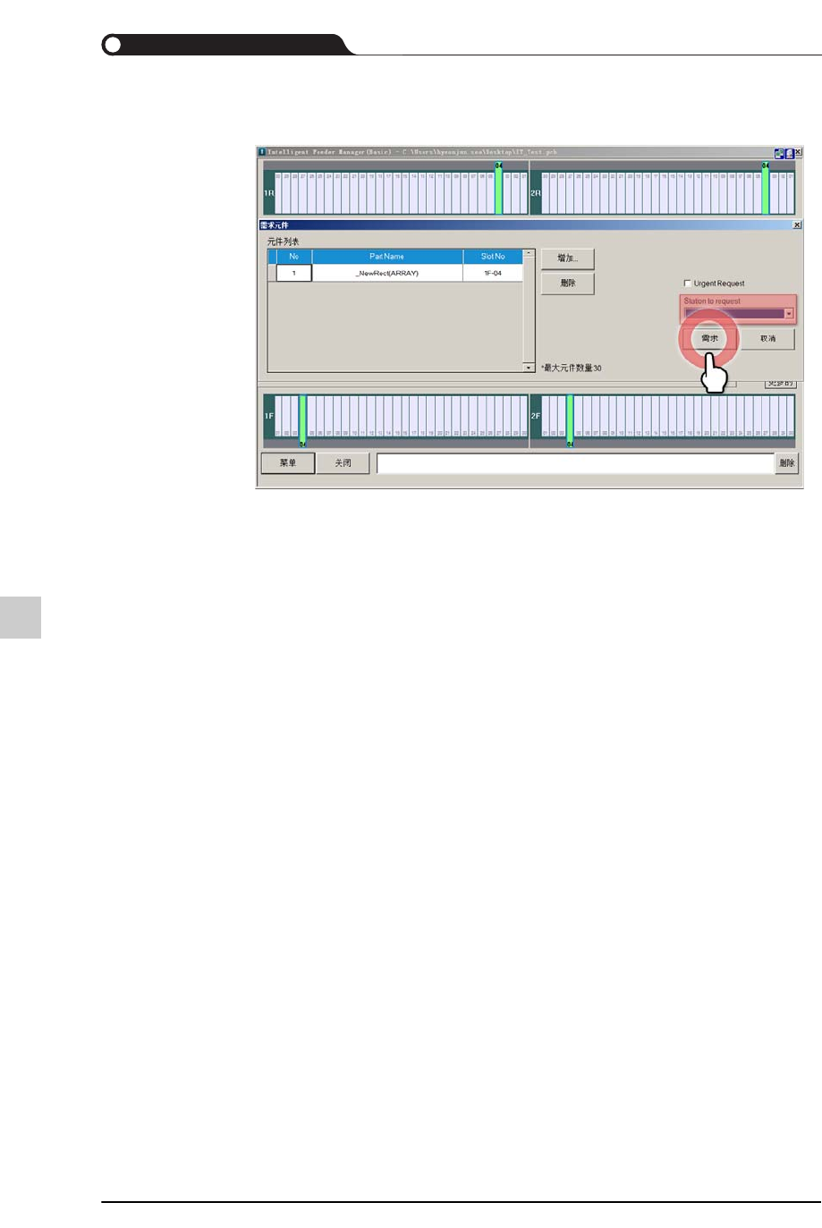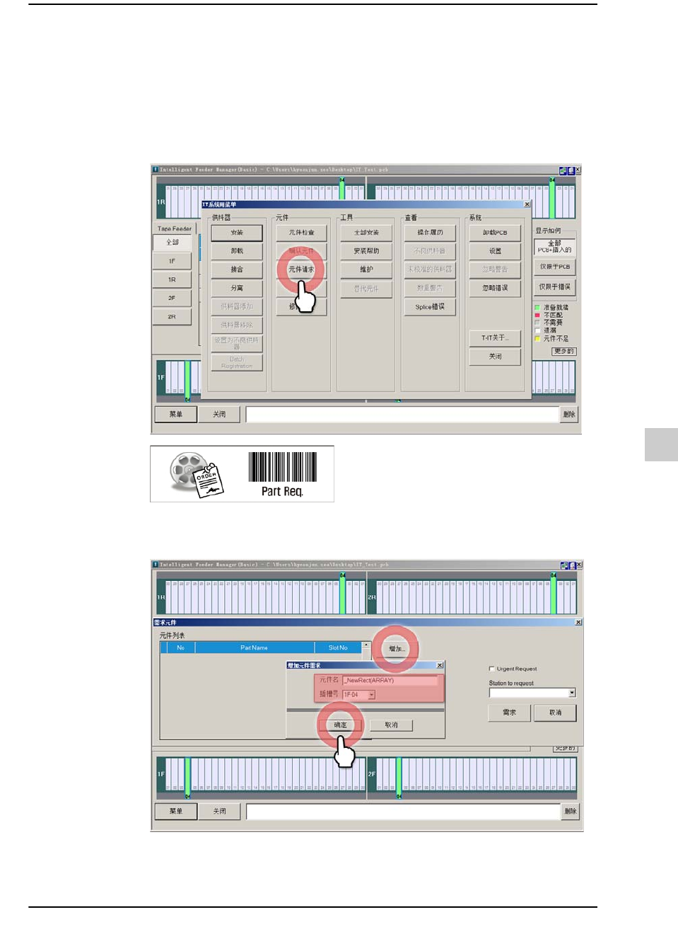 14-7 生产过程中的对应措施 14.3. 元件请求 元件不足时能以远程方式向材料室 (Partstati on) 请求所不足的元件。 向材料室请求不足的元件的步骤如 下。 STEP1. 单击 < 元件请求 > 按钮实行 ‘ 元件请求 ’ 对话框或扫描请求条形码。 STEP2. 扫描不足元件的条形码或者单击 < 增加 > 按钮, 输入需要请求的元件名与 相应插槽号后, 单击 < 確定 > 按钮。