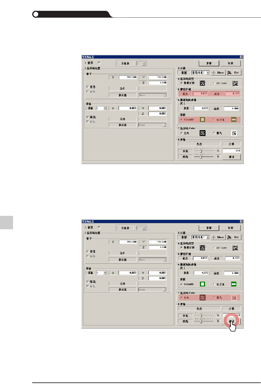 STEP6. 选择2D 条形码颜色后单击<Test>按钮进行2D条形码识别测试