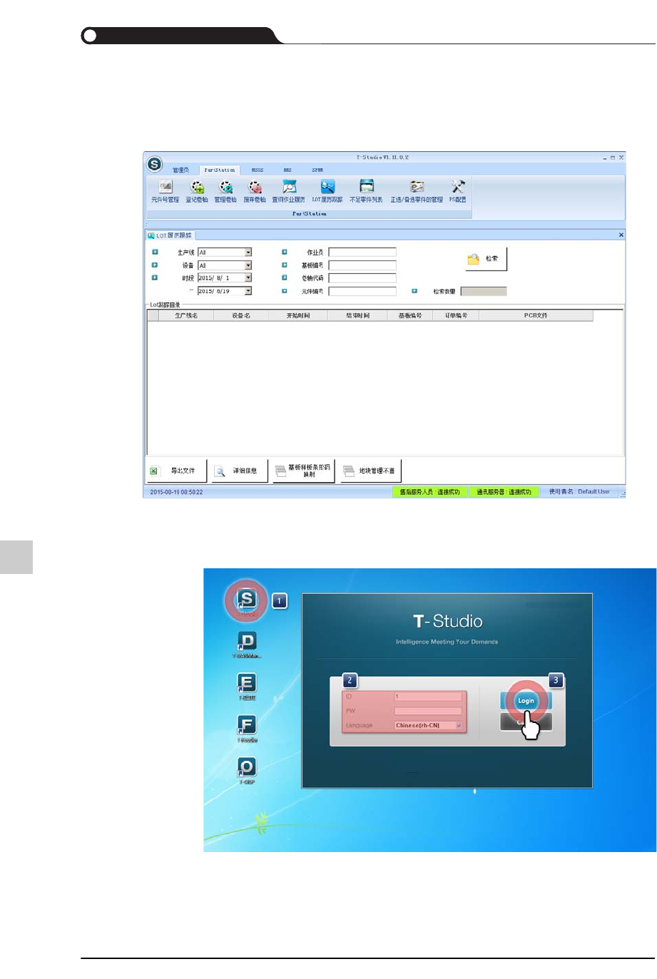 16-10 {TzYG|˅Gn {TzYG|˅Gn 16.5. 查询生产历史 可以在 T -Studio 的 PartStation 查看各生产线及设备的基板生产历史。 下面是在 T -Studio 查询生产历史的步骤 。 STEP1. 实行 T–Studio 输入账号与密码,选择需要使用 的屏幕语言 ( 中文 [zh-CN]) 后,单击 <Login> 按钮