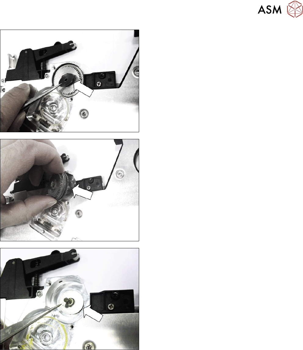 6 Reparaturen an SmartFeeder 4 mm X 6.10 Stopfrad Serviceanleitung SIPLACE SmartFeeder 4 - 104 mm X 11/2017 61 ► Entfernen Sie die obere Beilagscheibe vom Stopfrad. ► Entnehmen Sie das Stopfrad. ► Sollte die untere Beila…