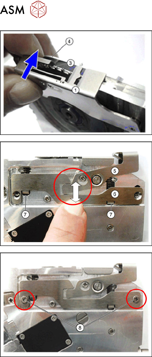 7 Reparaturen an SmartFeeder 8 mm X 7.5 Abholfenster 92 Serviceanleitung SIPLACE SmartFeeder 4 - 104 mm X 11/2017 ► Führen Sie das Abholfenster (1) vorsichtig über das Stiftrad (3) und über die rechte Kante (4) des Zufü…