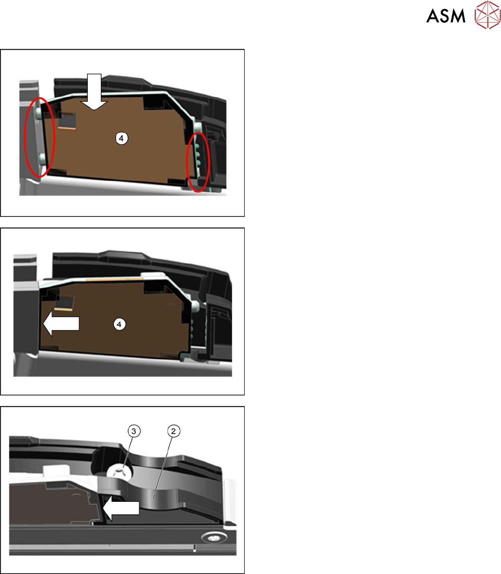 7 Reparaturen an SmartFeeder 8 mm X 7.6 Spleißsensor Serviceanleitung SIPLACE SmartFeeder 4 - 104 mm X 11/2017 97 ► Setzen Sie den Spleißsensor (4) wie abgebildet an Stelle des Dummys ein. Beachten Sie dabei, dass die 2…