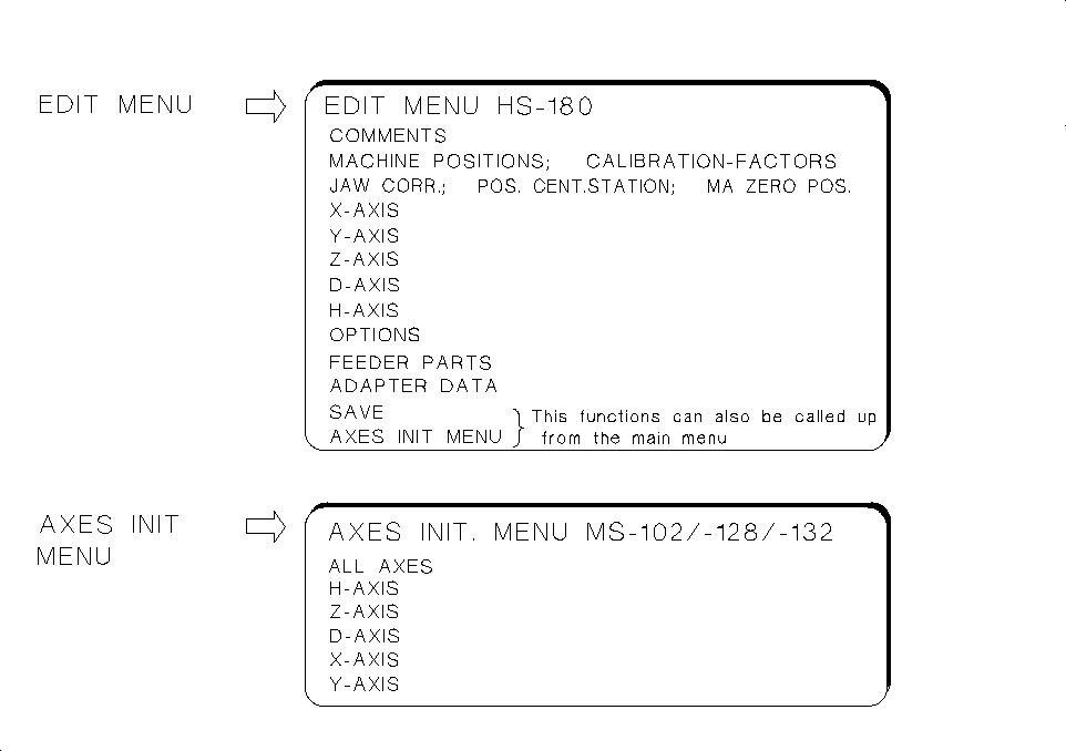 • From the EDIT MENU it is also possible to call up the AXES INIT MENU (see submenu) to ensure, for instance,