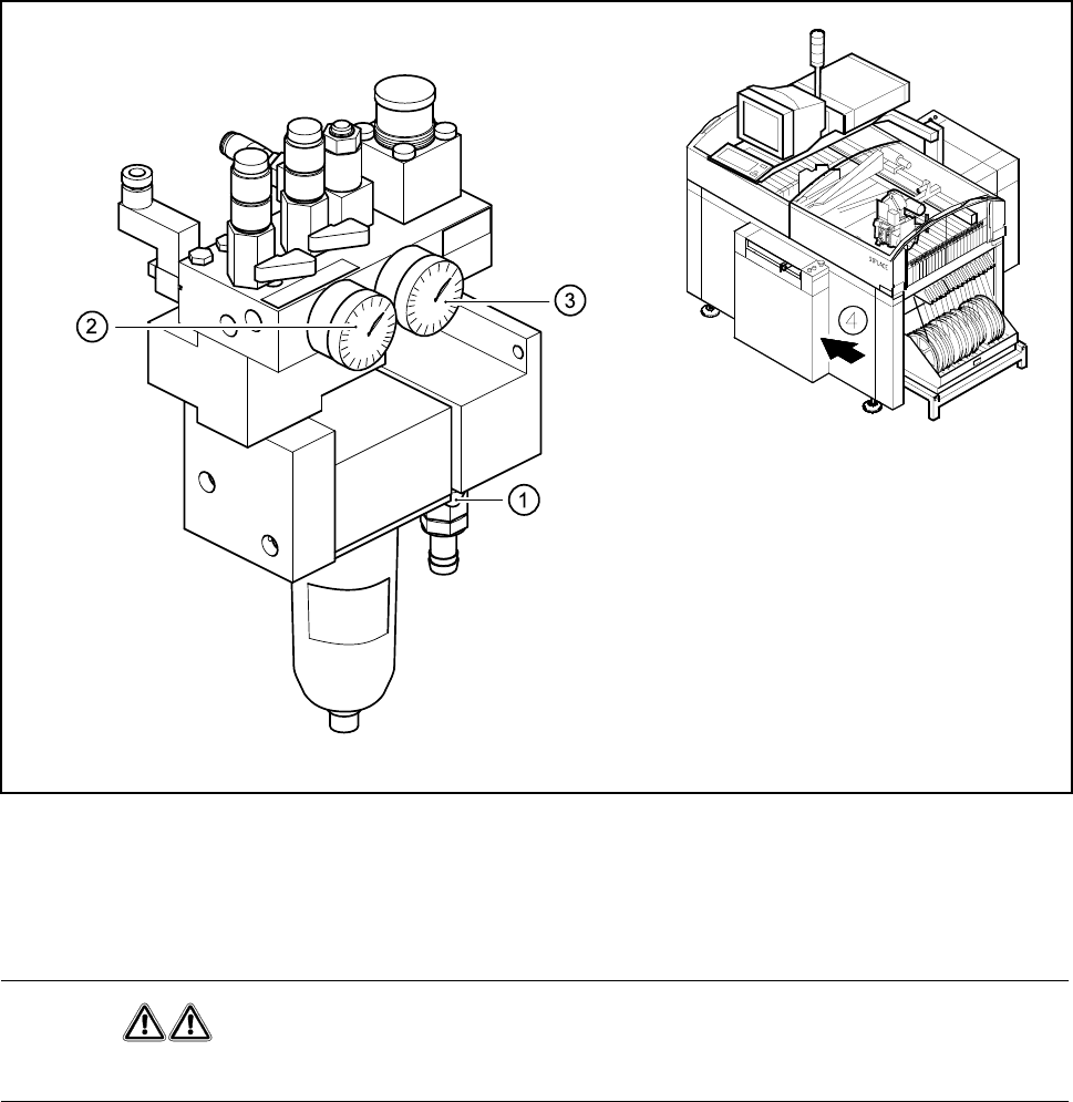 - Iaktta drifttrycksmanometern och manometern för anslagets tryckluftsmatning (Pos. 2 och 3 på Bild 1.4.1)