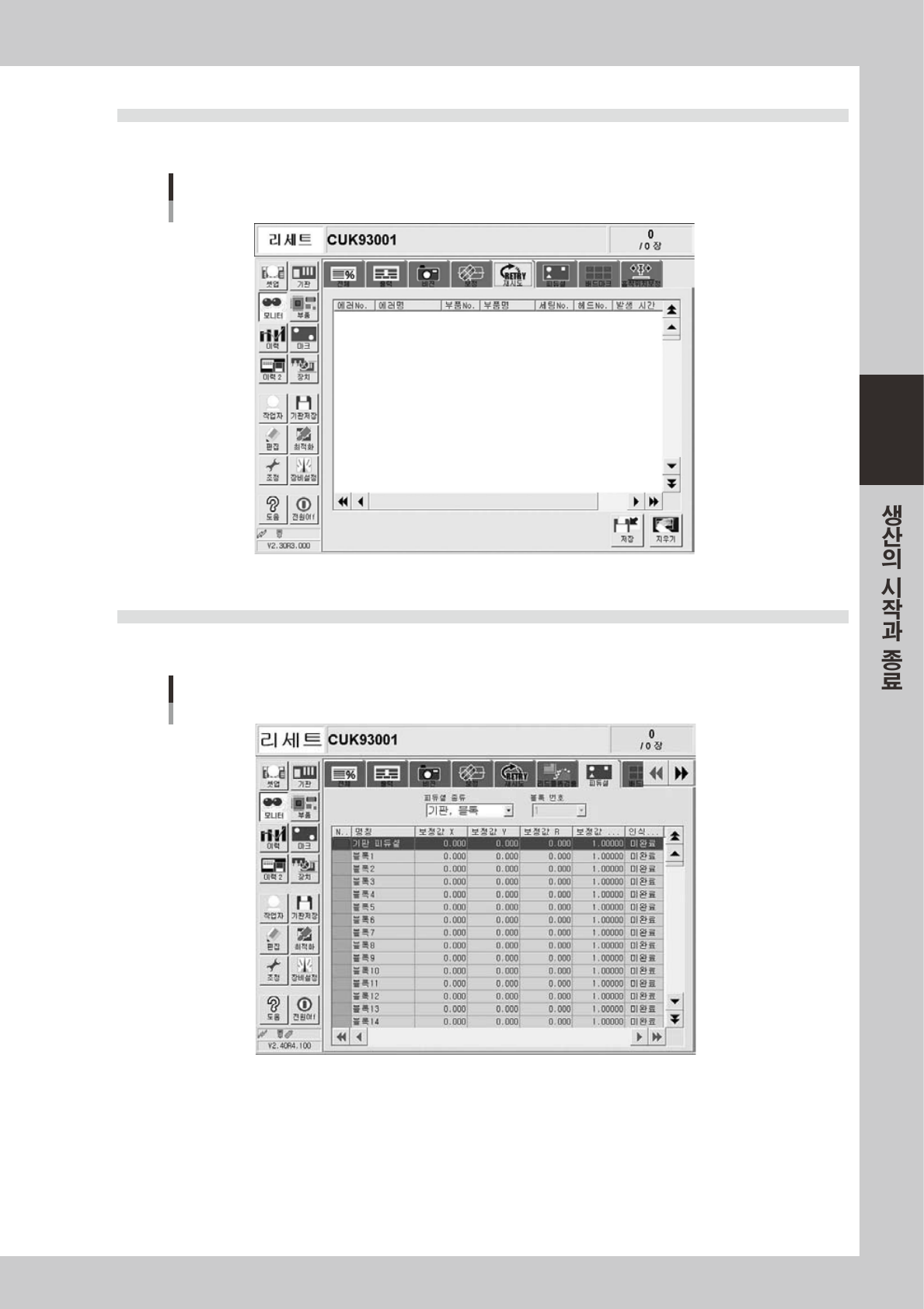 적색 에러 흡착위치보정사양에설정된노즐데이터별로에러레벨의수치를초과했습니다 .