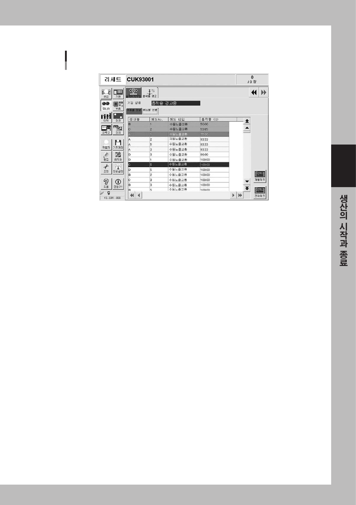 은 표시되지 않습니다 . 운전중의 흡착율의 상태는 , 행의 색깔로 판별할 수 있습니다 .