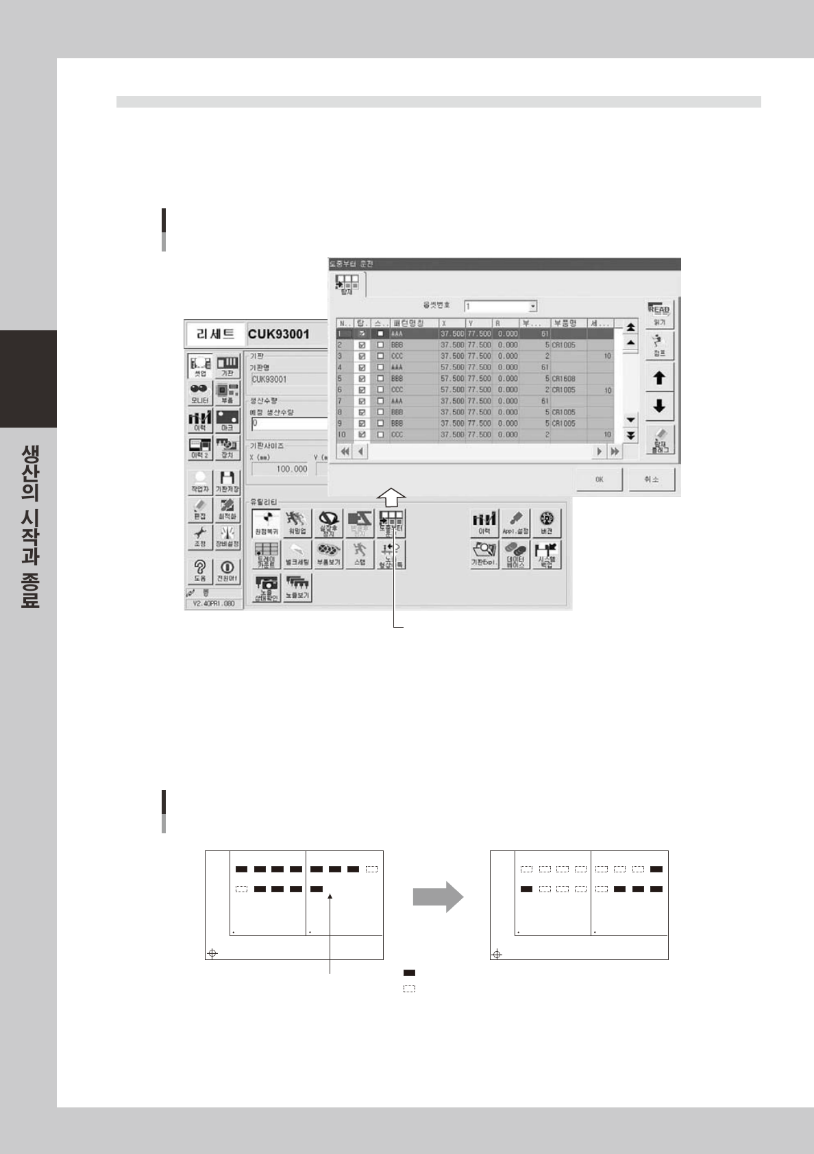 [ 장치 ]-「컨베이어」탭화면을열고 ,기판에맞춰컨베이어폭과기판고정유니트를조정하십시오 .