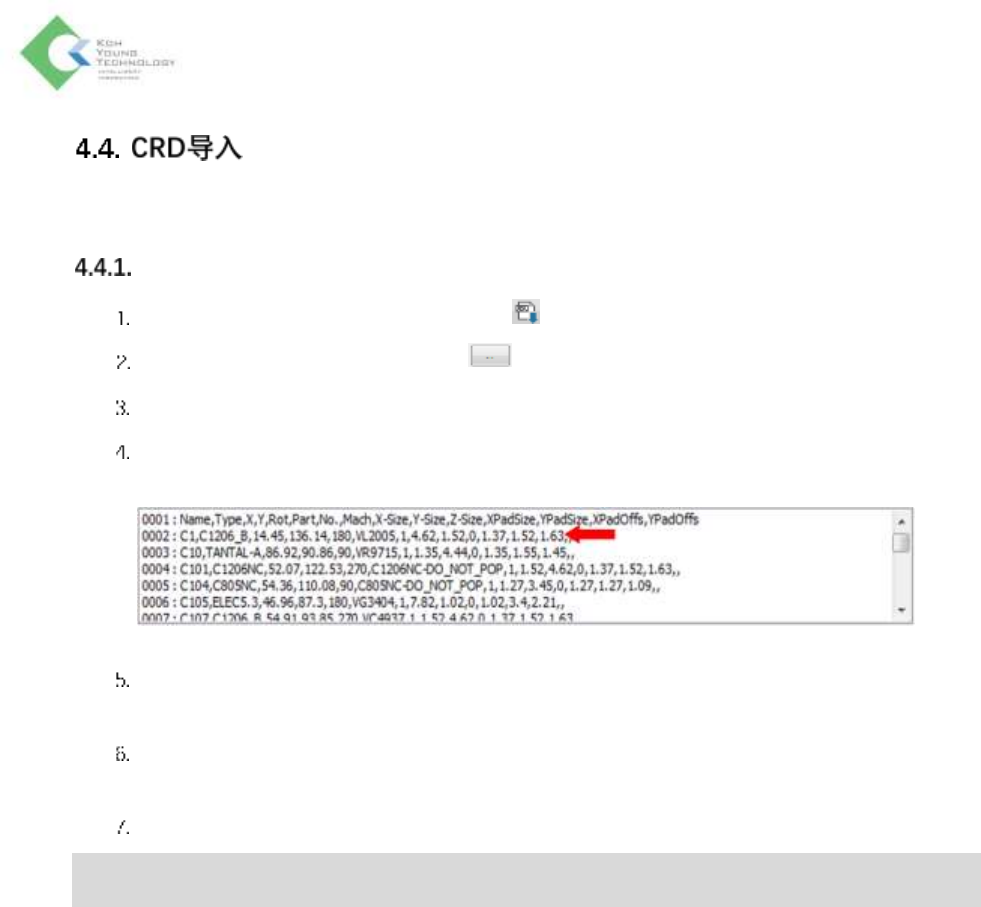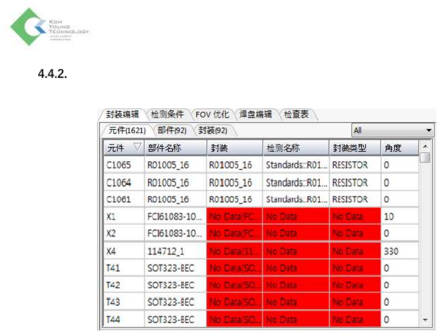 K oh Y oung Technolo g y Inc. 101 导入 CRD 文件之后 所导入的 CRD 信息更新在选项选项卡 右上侧的元件目录上。 更改的 元件 信息将不会与数据库里的信息相匹配。 这些信息会显示为红色标记“ No Data ” 。请 利用数据 库管理器或封装登录菜单登录这些 元件 的封装信息 。