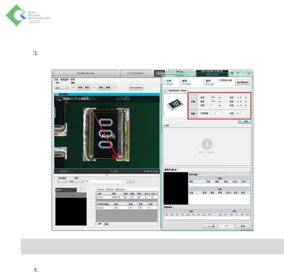 K oh Y oung Technolo g y Inc. 106 查看元件检测结果 当元件检测结束时会出现不良视图, 可以查看封装信息设置是否正确 。通过 Enlarge 3D 选项 可以 查看元 件厚度。点击界面左下侧的“ Enlarge 3 D ”按钮,用 Pallet Height 或 Cross Section 选项 查看 高度 ( 厚度 ) 。 需要的话,编辑不良视图界面的检测 条件选项卡和封装编辑选项卡的 封装信息,然后再…