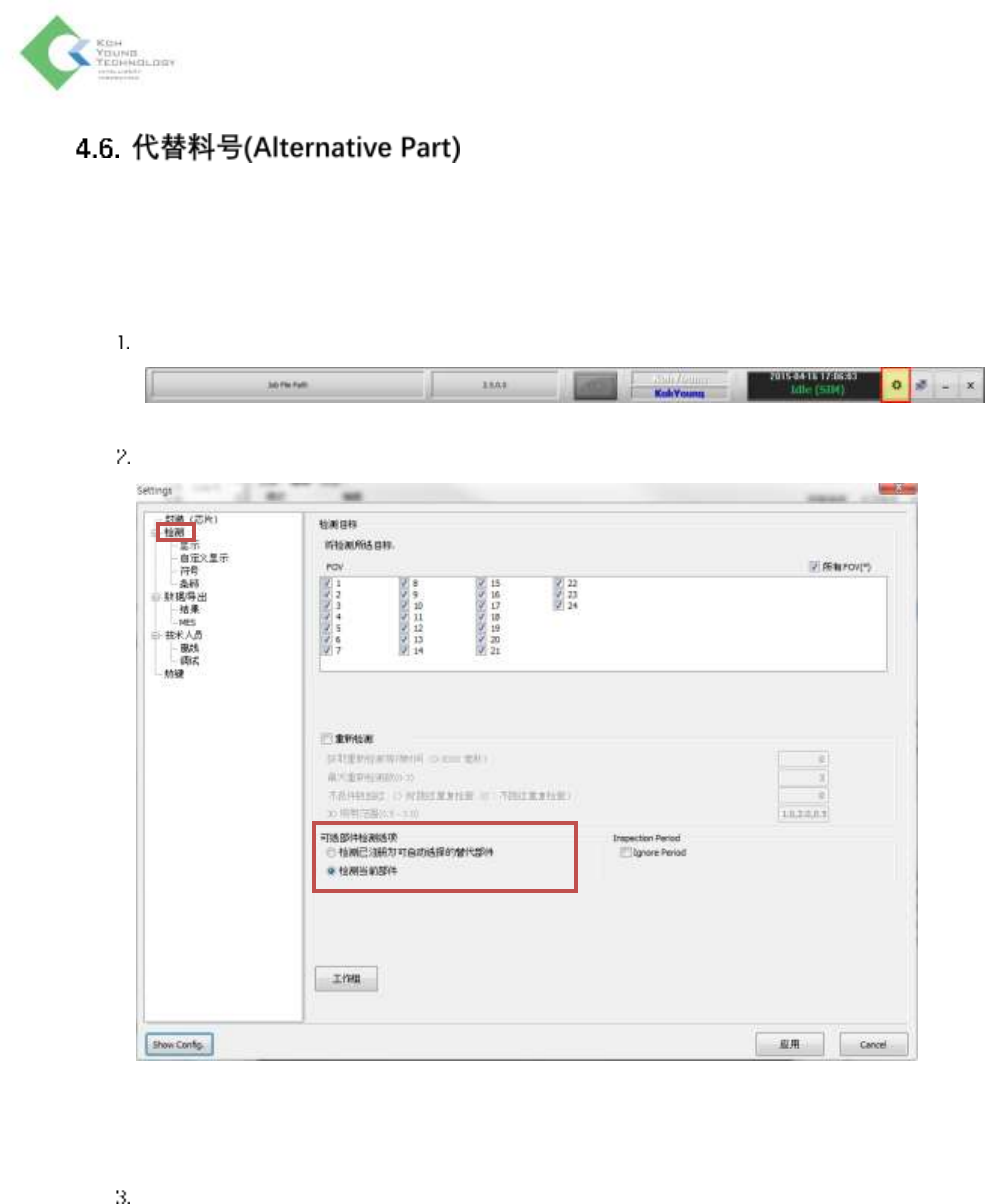 显示设置窗口时,在左侧菜单点击Inspection项目设置“Alternative Part Inspection Option”。