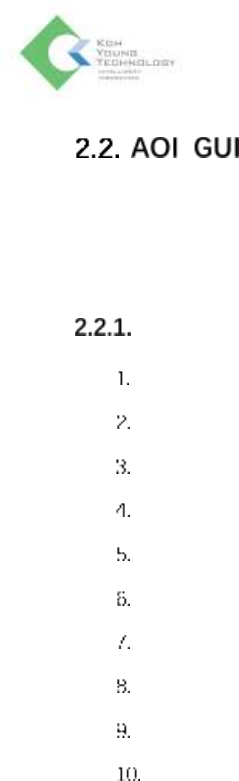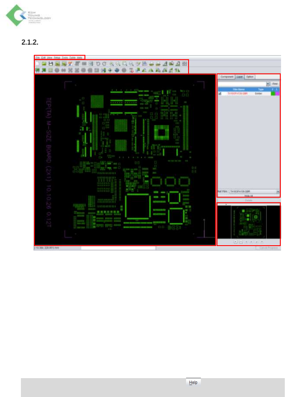 K oh Y oung Technolo g y Inc. 11 ePM- AOI 的用户界面 Main Menu bar ( ① ): 是 ePM-AOI 的基本菜单,位于显示窗 的左上侧。 Tool bar ( ② ): 包括 ePM-AOI 所需的大部分工具的工 具栏,位于显示窗的左上侧。 Main View ( ③ ): 是主显示界面,显示 Gerber 和 CAD 文件, 位于显示窗的中间。 List View ( ④ ): …