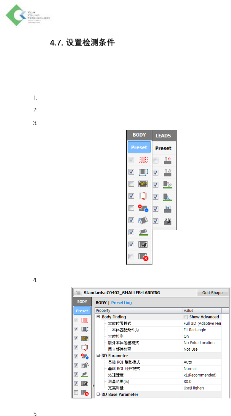 K oh Y oung Technolo g y Inc. 113 所有元件信息和检测条件要保存在程 式文件里。 元件 可分为 Standard 和 Chips ,选项选项卡 的检测条件 选项卡可编辑对各不良类型的检测条 件。 为了设置检测条件,请按照以下步骤 操作。 登录封装信息之后,点击检测条件选项卡。 从元件 目录 中选择元件。 确认检测算法和不良类型。 点击 PreSet ,设置本体位置 模式与检测模式。 对相关项目设置各算法的…