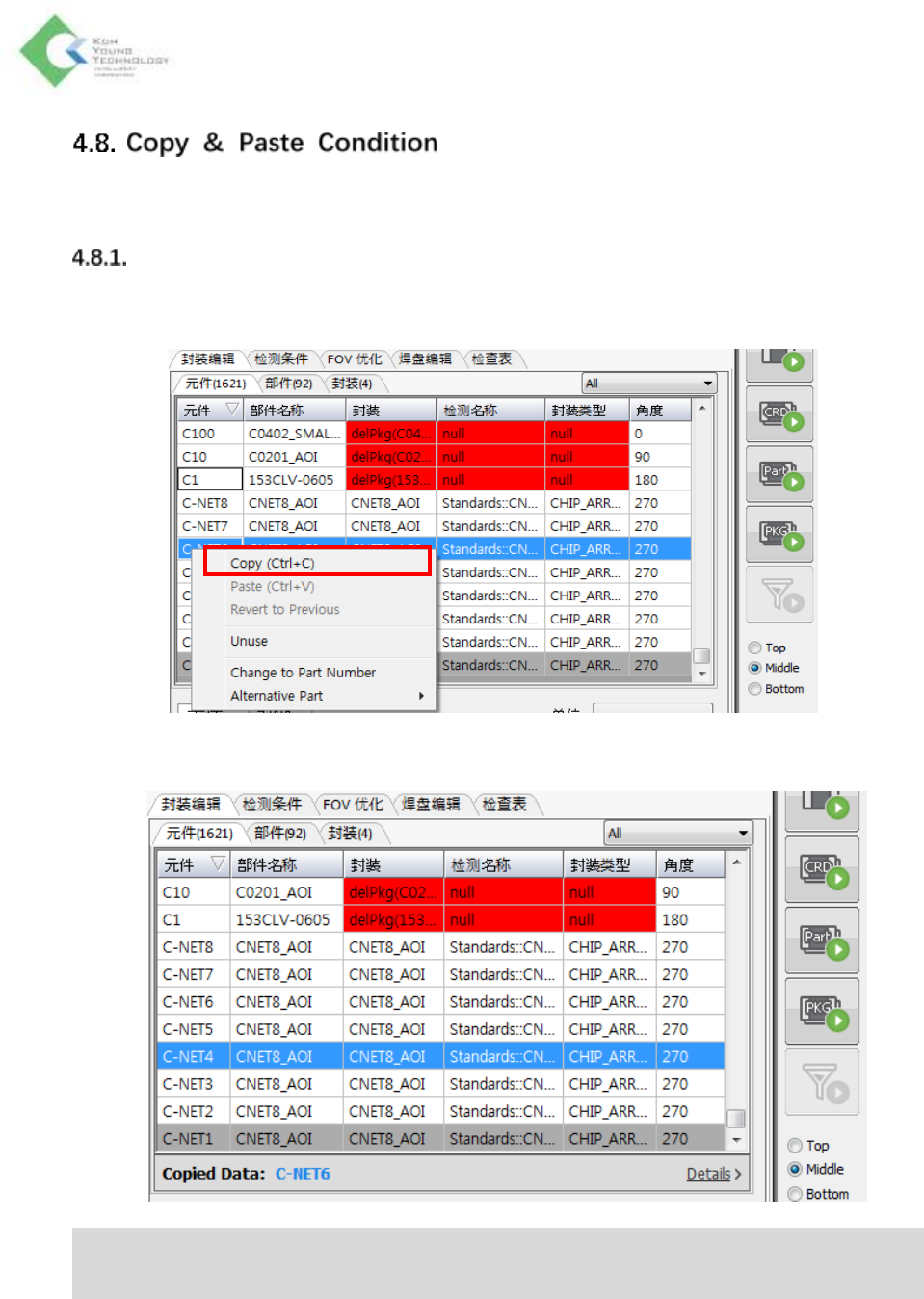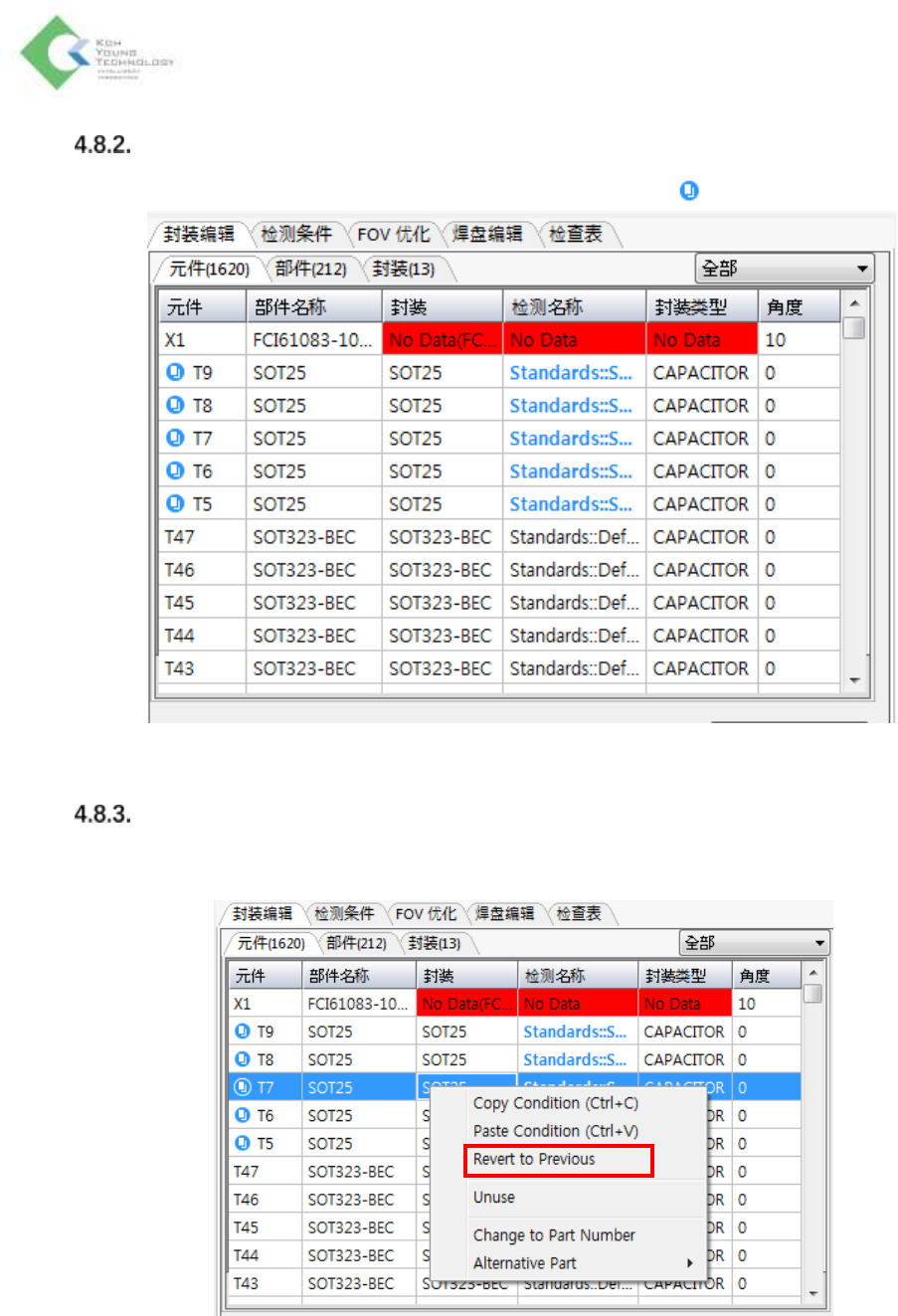 K oh Y oung Technolo g y Inc. 116 功能应用 使用 Copy & Paste Condition 功能粘 贴检测条件的元件右边会出现粘 贴 图标。 恢复设置 对粘贴好检测条件的元件,如果要恢 复原来的检测条件,在元件 列表点击鼠标右键,然后菜单中 选择 Revert to Previous 。但,如果原来的 检测条件为 Default 值, Revert to Previous 功能就不被激活。