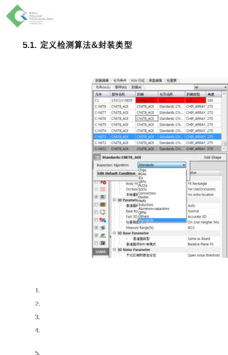 为了用AOIGUI执行3D检测,需要设置对各元件的检测条件。设置对各不良类型的封装尺寸和检测算