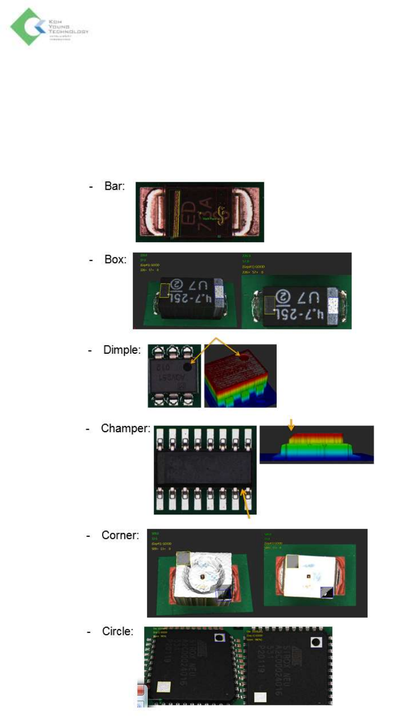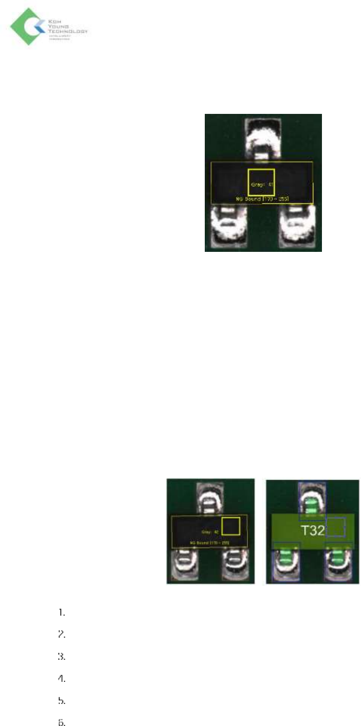 K oh Y oung Technolo g y Inc. 129 本体 – 反白 (Upside do wn) 翻件检测会 计算 和比较 ROI 平均亮度与检测条件,如果 结果值不在于检测条件范围之内,则 被视为翻件 不良。 ➢ Inspection Mode 模式 - Gray: 以 Gray 图像的平均灰度值检测 - Color: 以各 Red/Green/Blue 色彩图像的平均灰度值检测 ➢ Tolerance - 亮度 …