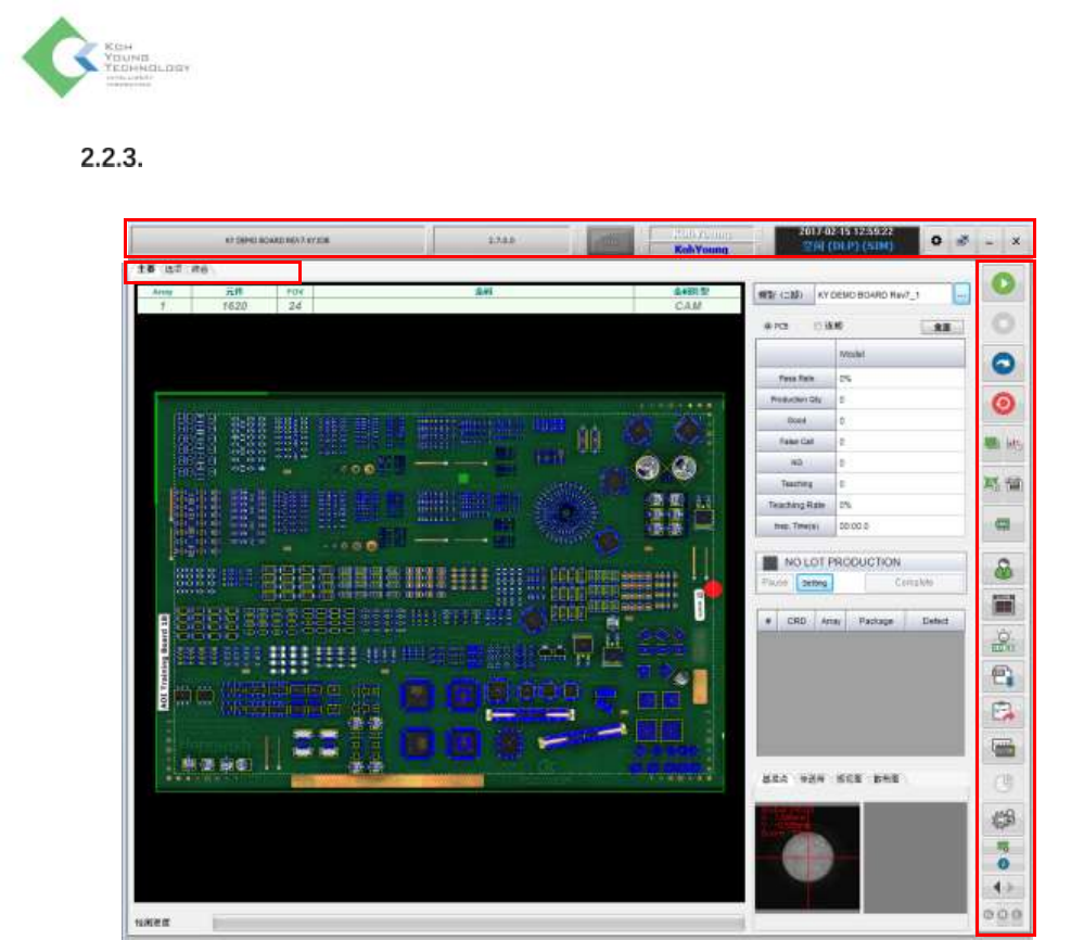 K oh Y oung Technolo g y Inc. 15 主要 选项卡 左侧界面 ( ① ) PCB / 条形码信息 - 连板 : 引导的程式文件的连板数 - 元件 : 引导的程式文件配件数 - FOV: 引导的程式文件 FOV 数 - 条形码 : 引导的 程式文件条形码信息 - 条形码类型 : 引导的 程式 文件条形码种类 PCB Viewer: 显示引导的 PCB 图片 检测进度 : 板的 图片 左 下面有 检测…