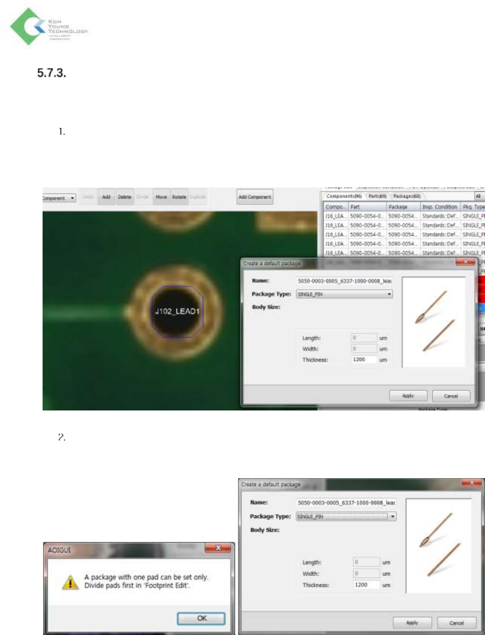 K oh Y oung Technolo g y Inc. 166 THT(Circle Pad) 检测条件 进行 Through Hole 检测时,部分引脚 爬锡检测项目中添加了 Circle Pad 功能。 如要使用 THT 检测功能,首先要添加 Single Pin 类型的封 装。如下所示,在现有 Crea te a default package 窗或在 Program ming > PackageEdit 标签,将 Pa…