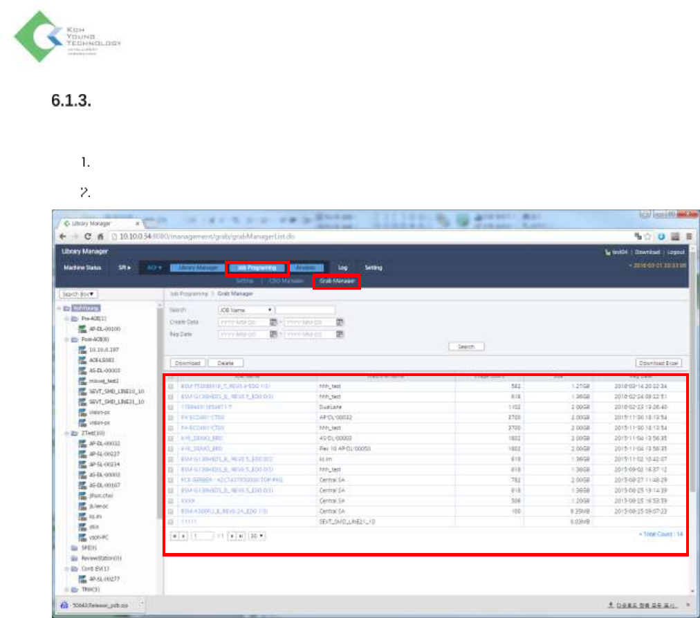 K oh Y oung Technolo g y Inc. 170 Full Grab 图像的收集确认 如要确认是否正常收集 Full Grab 文件 ,请按以下顺序进行操作。 运行 LM2. 0 W eb Ma na ger 后,移至 AOI > Jo b Pro gra mm in g 选项卡 > G ra b M ana ger 菜单。 可以在目录中确认收集的抓屏数据。
