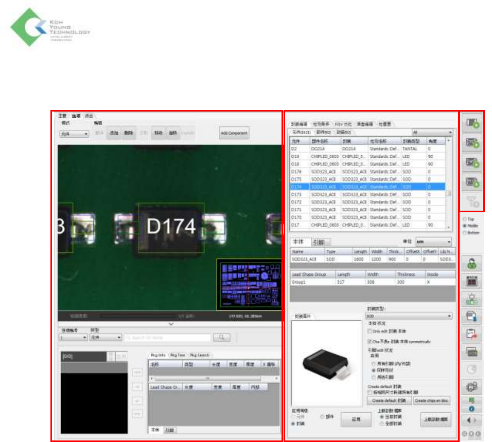 K oh Y oung Technolo g y Inc. 19 选项 选项卡 左侧界面 ( ① ) 选择模式 : 从元件、未使用 、重新使用模式中选一个 - 选择元件模式时 : 可以编辑 和检测 - 选择未使用模式时 : 对 所选 的元件不进行检测 - 选择重新使用模式时 : 将已设置成“未使用” 的元件 重新 设置为可检测状态 编辑 : 元件 编辑 - 撤消 : 撤销 - 删除 : 按设置的范围将封装全部删除 - 分割 : …