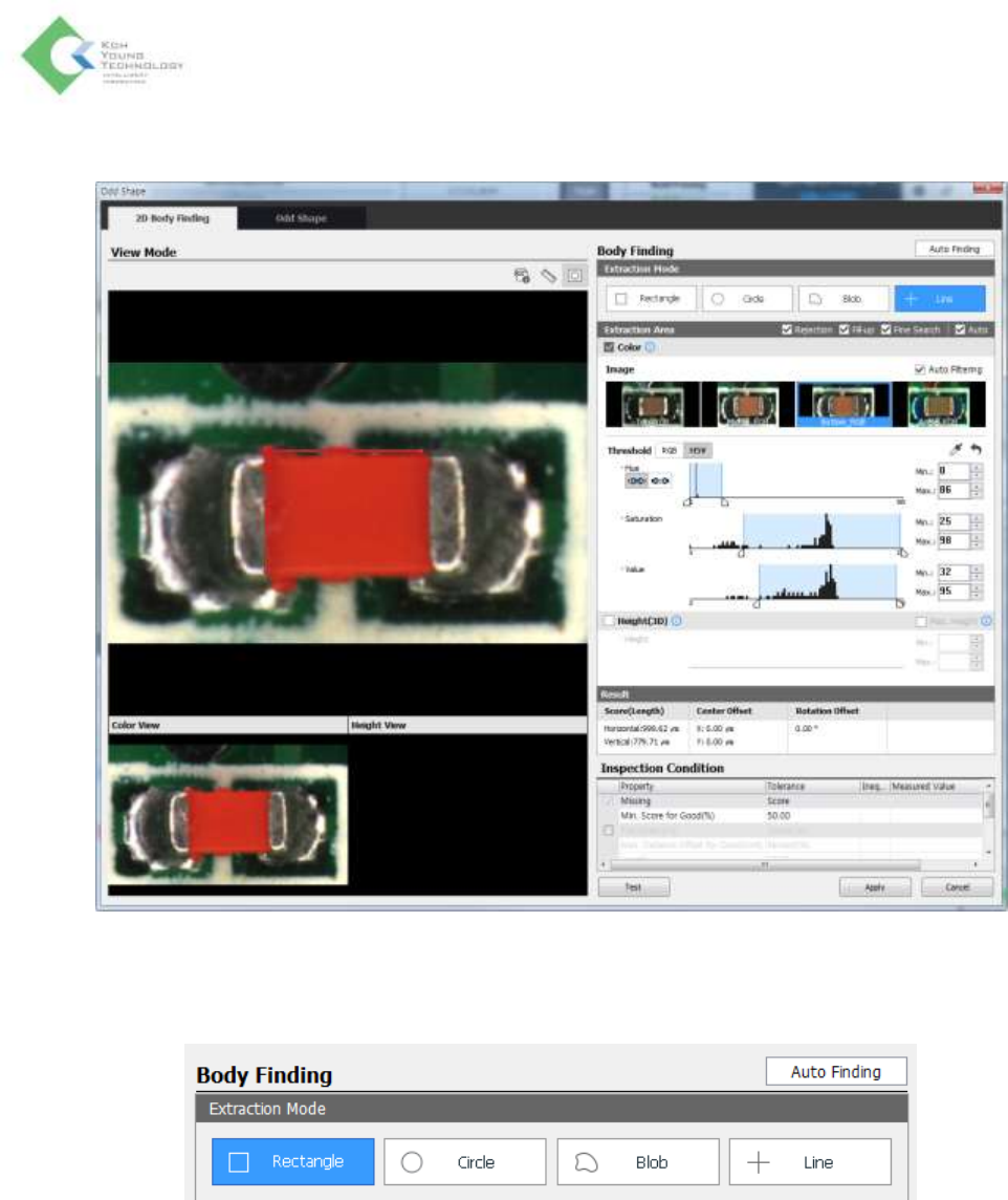 K oh Y oung Technolo g y Inc. 222 2D 本 体定位功能 (2D Body Finding) 是 用 3D 难以提取本体的时候,却用 2D 提取本体的 功能。 1. 请在编程栏 > 检测条件 栏 > 本体预设的 Body Location Mode 设为 Odd Shape 。 2. 将 下级菜单的 模式 ( Mode) 设置为 2D Body Finding 后 ,请点击 应用 。 3. 请…