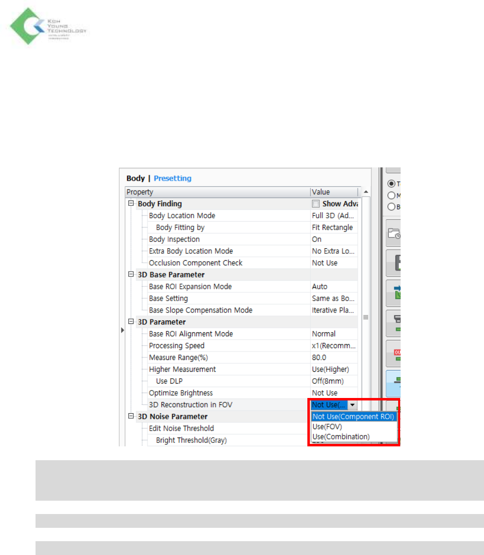 K oh Y oung Technolo g y Inc. 231 5. 请设置本体预设 > 3D 参数 > 3D Reconstruction in FOV (在 F OV 内创建 3D 图像 )项目。 - Not Use(Component ROI): 在 CPU 重建 3D 图像(与以前同样) - Use(FOV): 用 GPU 重建 3D 图像 - Use(Combination) : 以组合 GPU 及 CPU 重…