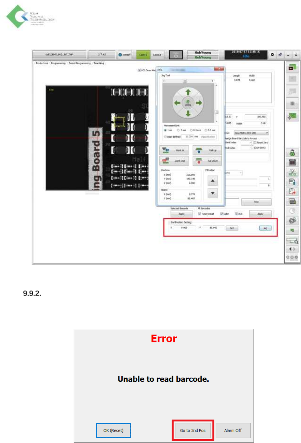 2. 显示如下条码识别错误窗口时,点击Go to 2nd Pos按钮,将镜头移动至已设定的位置。