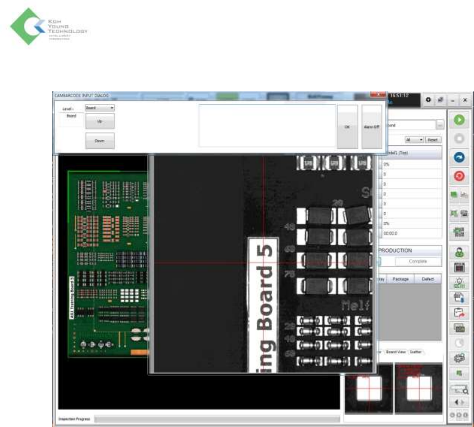 K oh Y oung Technolo g y Inc. 236 3. 设备状态变更为“ IDLE ”后,镜头移动 至所设定的位置时,显示如 下 Live Viewer 和 Cam Barcod e 的手 动输入窗口。 4. 在 Live Viewer 中查看条码 后,在手动输入窗口中输入条码,然 后点击 OK 按钮。 5. 点击开始检 测按钮 ,重新开 始自动检测 时,在 手动输入 窗口中输 入的条码 信息将被 用作相应 基板 的条…