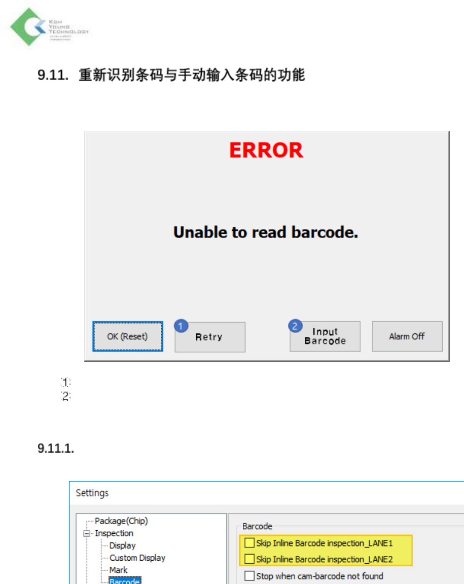 使用设置 > 检测 > 条码菜单的Skip Inline Barcode inspection选项时,不显示条码错误窗口。