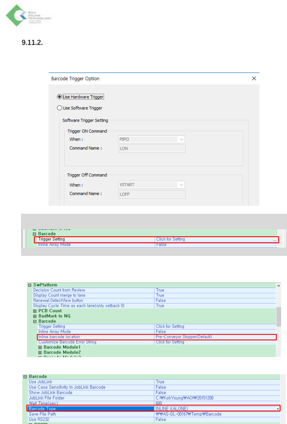K oh Y oung Technolo g y Inc. 243 设置项目 条码的设置 选择 Barcode Trigger Option 窗口 > Use Hardware Trigger 选项 ※ 注: 要想弹出 Barcode Trigger Option 窗口, 需进行如下设置: - 选择 AOIConfig > Barcode > Trigger Setting > “Click for Sett…