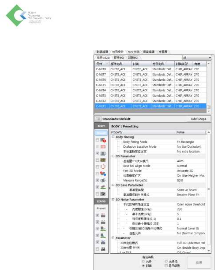 K oh Y oung Technolo g y Inc. 25 中部界面–检测条件选项卡 元件目录 : 为了 设置 检测条件 ,从元件 目录 中选择元件。 检测算法 : 选择检测算法 - Preset : 预先设置初始检测条件 不良类型 : 要检测的不良类 型得到确认后会在左侧的检 测不良类型中自动打钩。 Show Advanced : 条件 设置的详细信息 检测条件参数设置窗口 : 设置 不同不良类 型的详细的检…