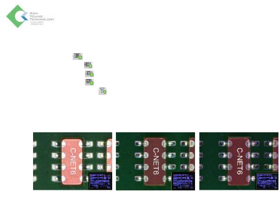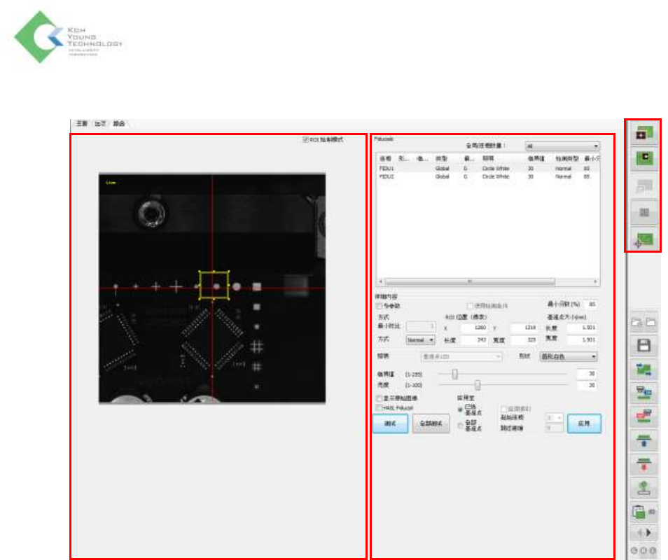 K oh Y oung Technolo g y Inc. 29 综合 选项卡 左侧界面 ( ① ) ROI 绘制模式 : 在画面上显示 ROI PCB Viewer: 实时画面 右侧界面 ( ③ ) 基准点 : 打开基准点 校准菜单 Pad Referencing: 打开 Pad Referencing 校准菜单 坏板标记 : 打开坏板标记校准菜单 CAM 条码 : 打开 CAM 条码 校准菜单 板 : 确…